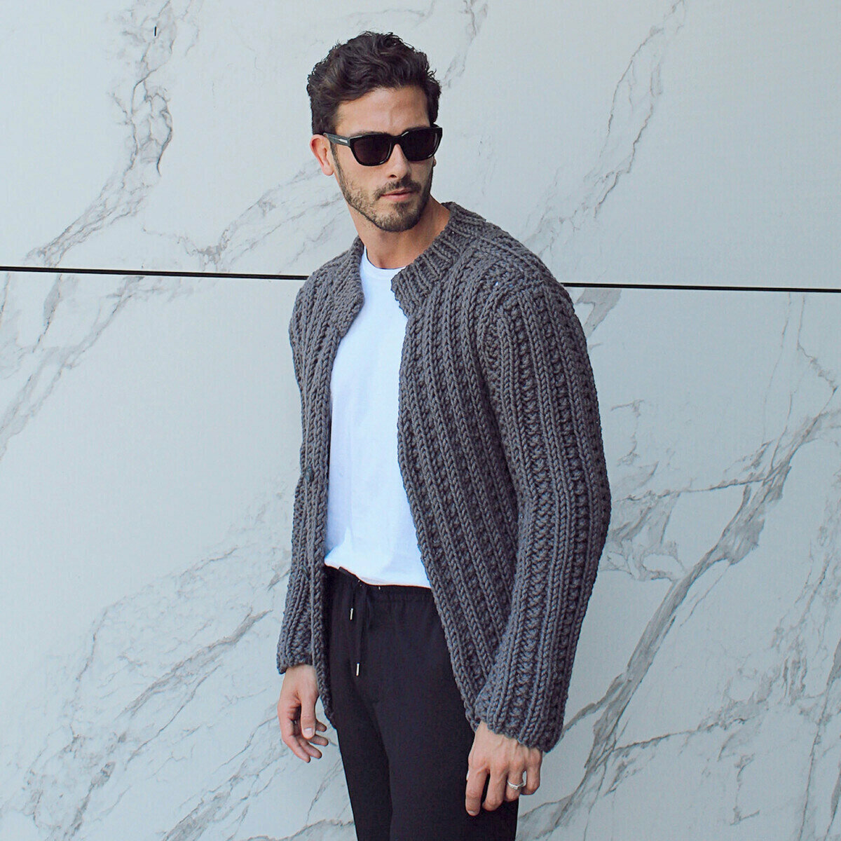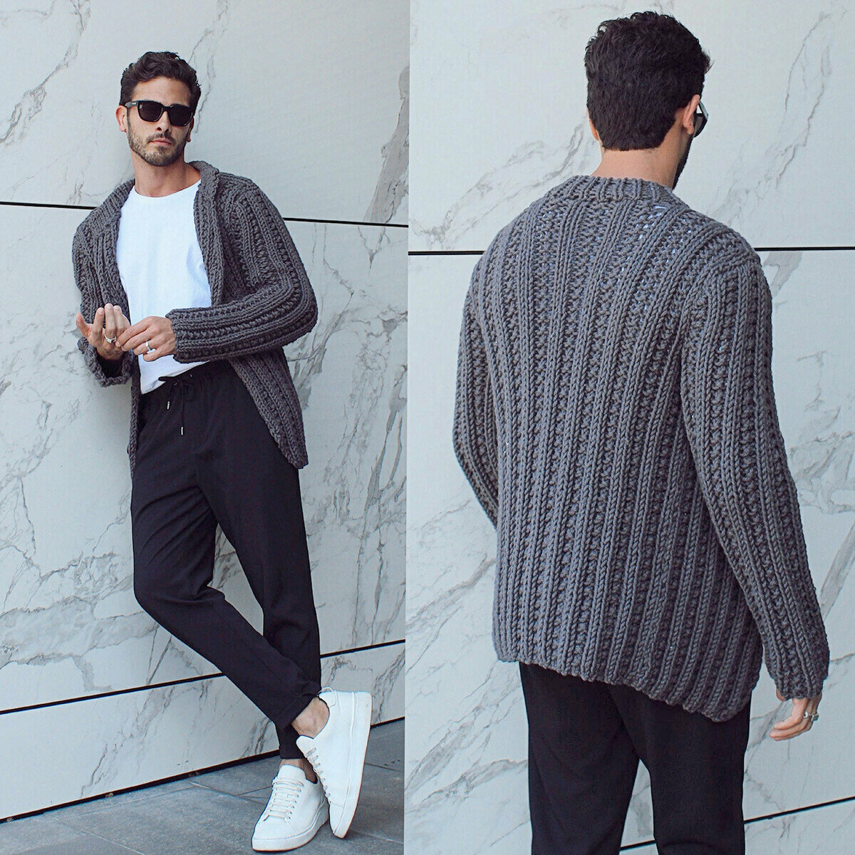 Объёмный графитовый кардиган спицами для мужчин (а то всё только нам, женщинам). Хотя модель можно смело называть универсальной! Стильная вещь с простым узором из лицевых и изнаночных петель.
