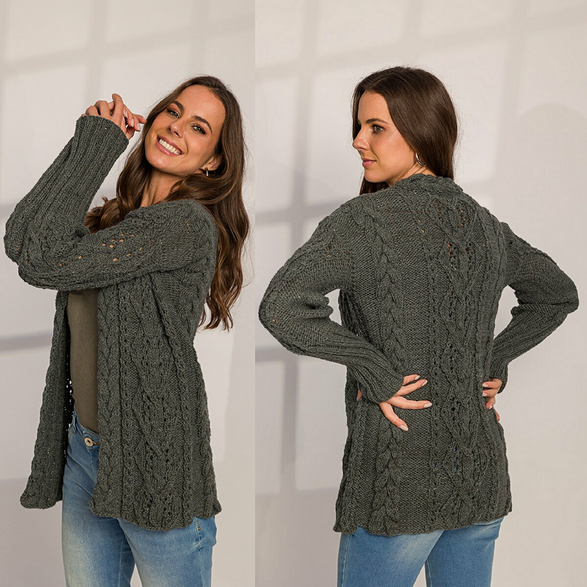 Стильный тёмно-серый кардиган спицами с длинными рукавами на узкой манжете-резинке. Уютная женская модель, украшенная объёмными косами, аранами и красивыми ажурами.