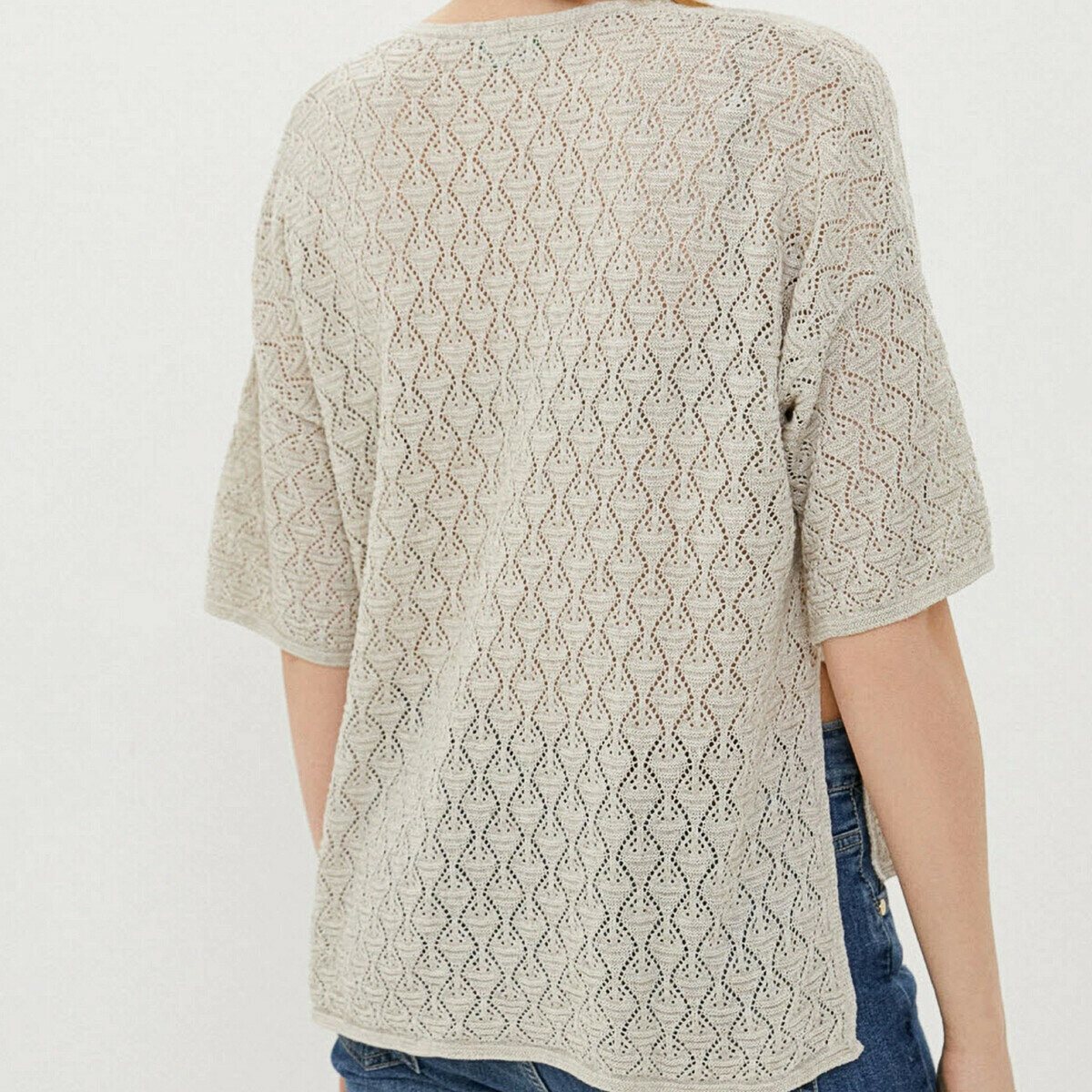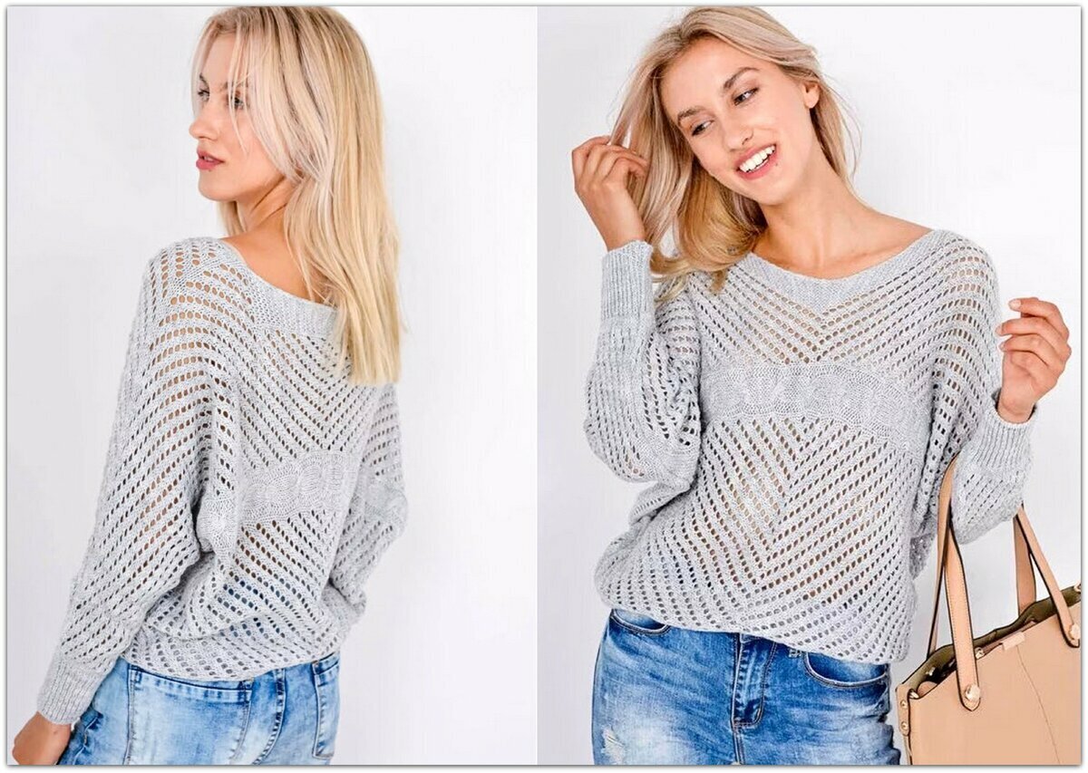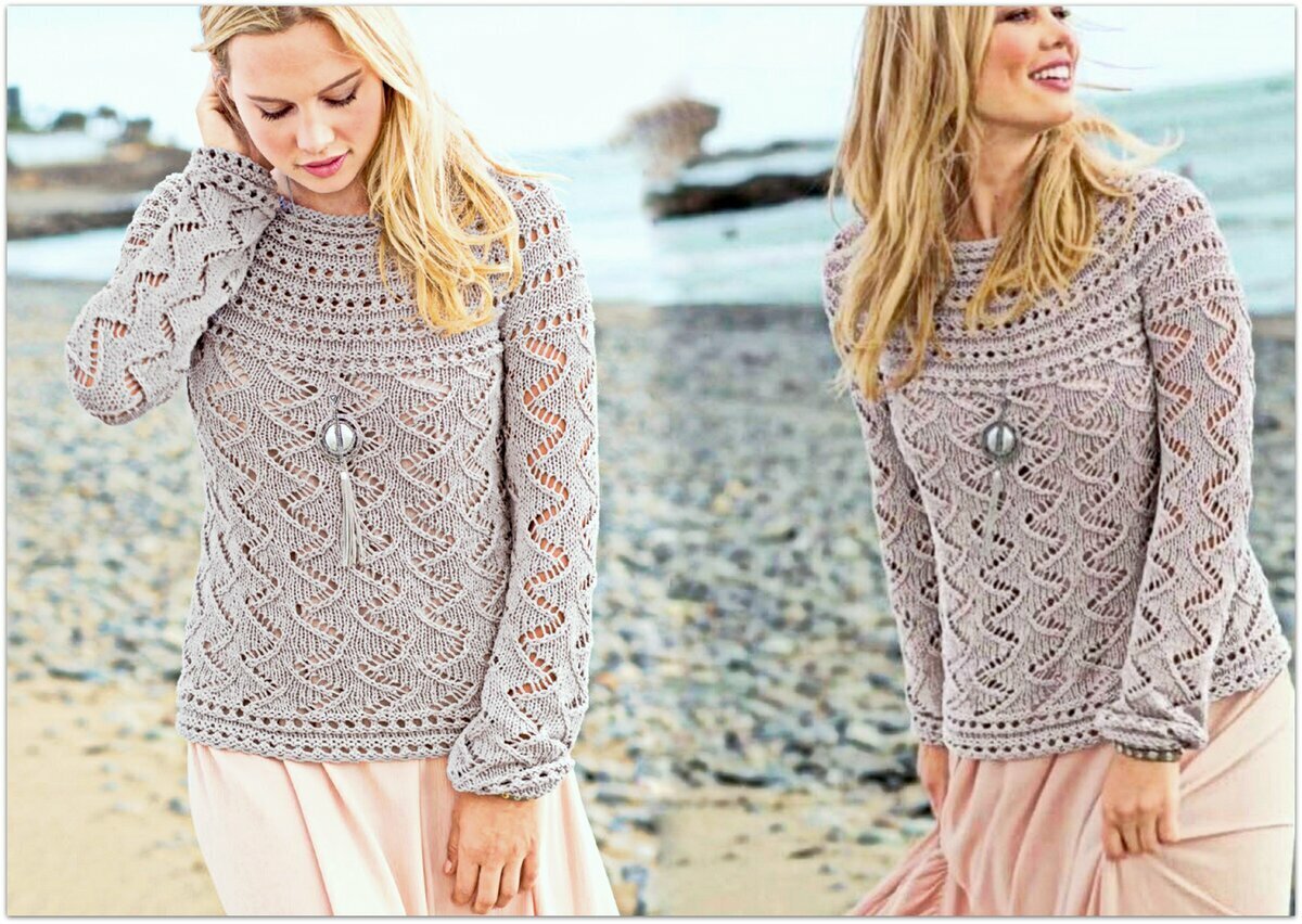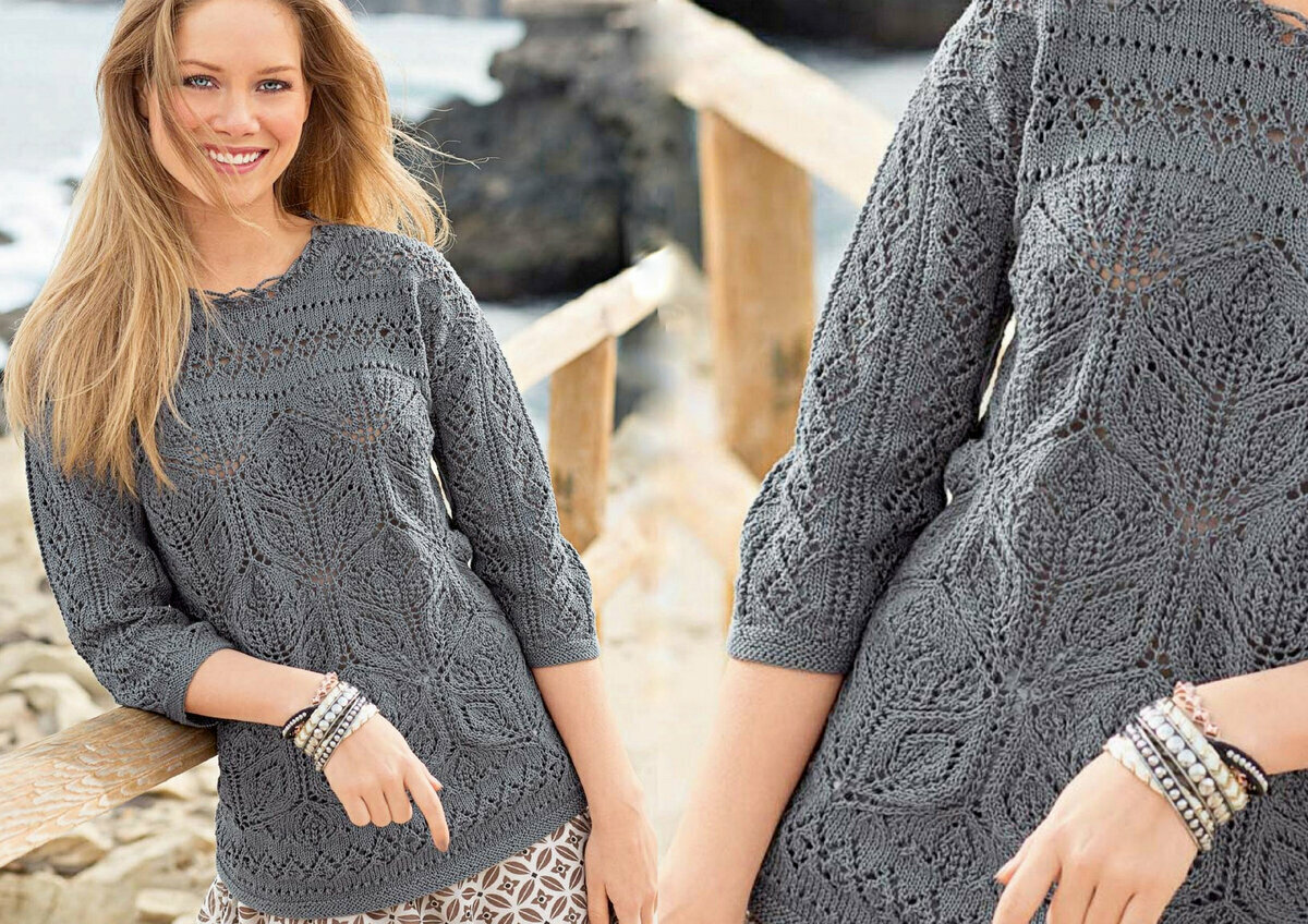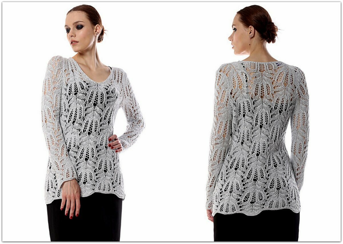 Облегающий светло-серый джемпер крючком с прямыми рукавами чуть ниже локтя. Эффектный ажурный узор, напоминающий кружевные веера. Прямой фасон, слегка спущенный рукав (хотя выкройка меня немного сбивает с толку — убавлений под проймы нет… но есть окат рукава), неглубокий вырез лодочкой (рекомендую всё-таки сделать вырез, а не вязать прямо, как на выкройке, чтобы не тянуло ворот назад).