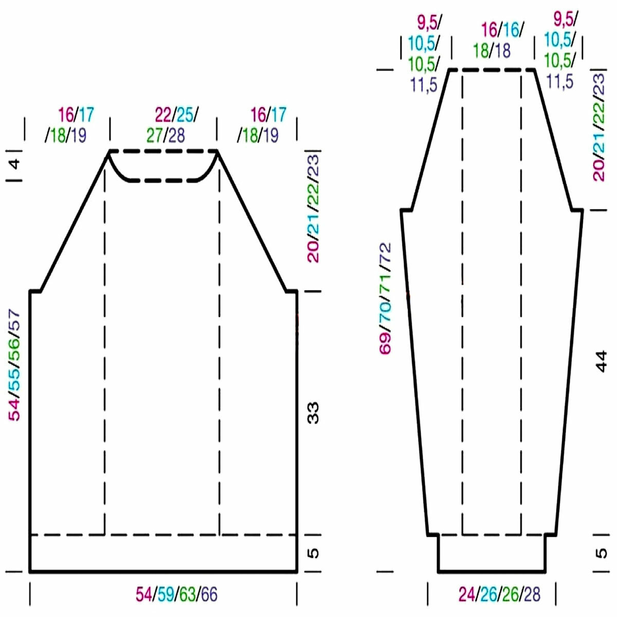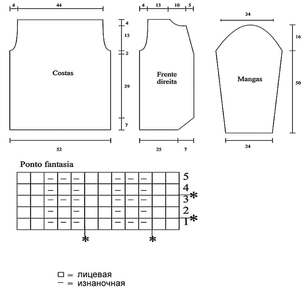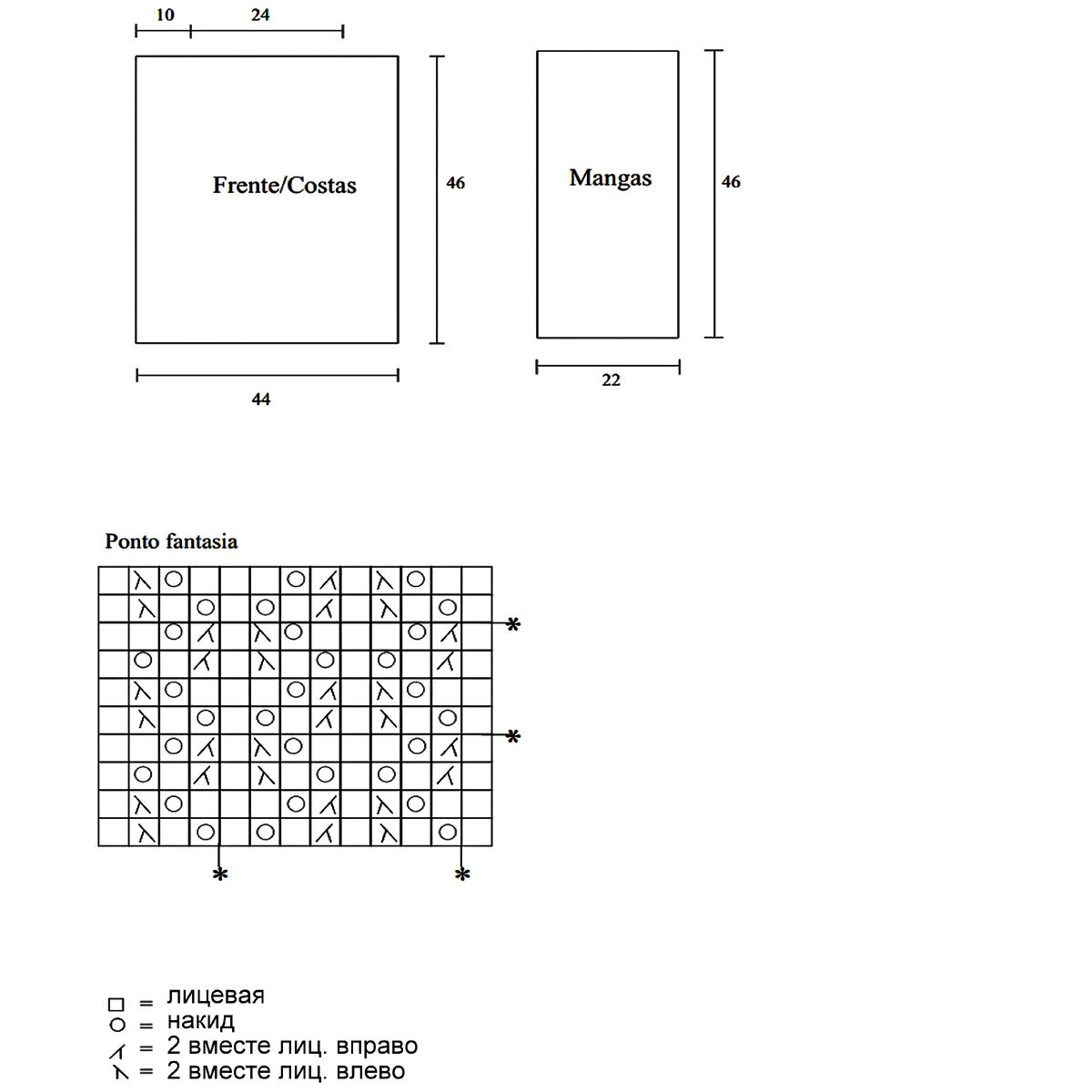 Модель имеет очень простой прямой фасон, спущенный рукав до локтя. Неглубокий вырез, который вяжется небольшим прямоугольником — его мы затем обвяжем дорожкой из вытянутых лицевых петель с перекрещиванием в центре (получится имитация V-образного выреза).