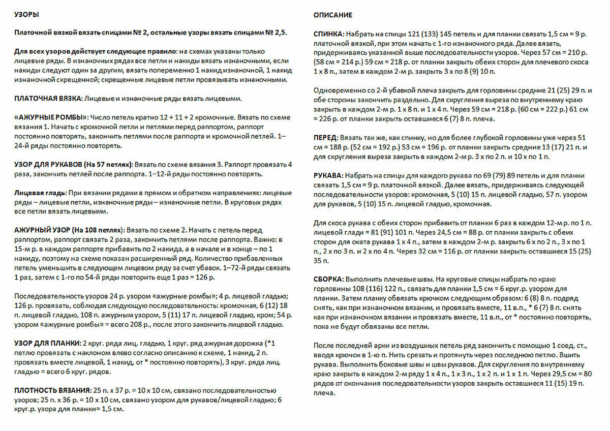 Пуловер вяжется из трёх частей: основная часть по кругу — перед и спинка, и отдельно поперечные рукава. Внизу пуловера и на рукавах идёт платочная вязка, V-образный вырез оформлен красивым кружевом крючком.