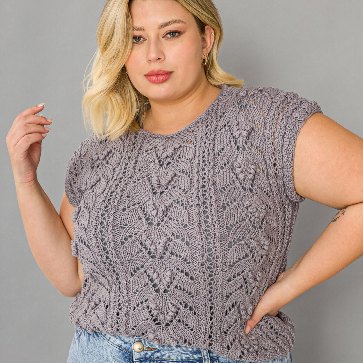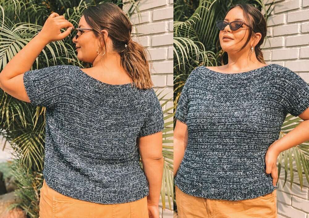 Симпатичный топ плюс-сайз спицамииз графитового меланжа с очень простым узором из лицевых и изнаночных петель. Если вы начинающая рукодельница и пока боитесь сложных узоров и выкроек — эта модель как раз для вас.