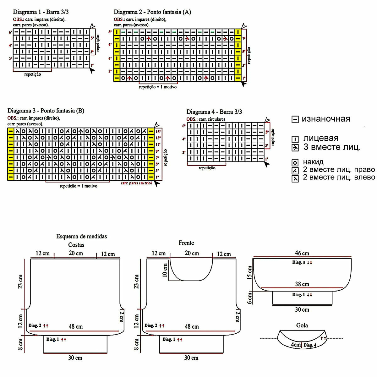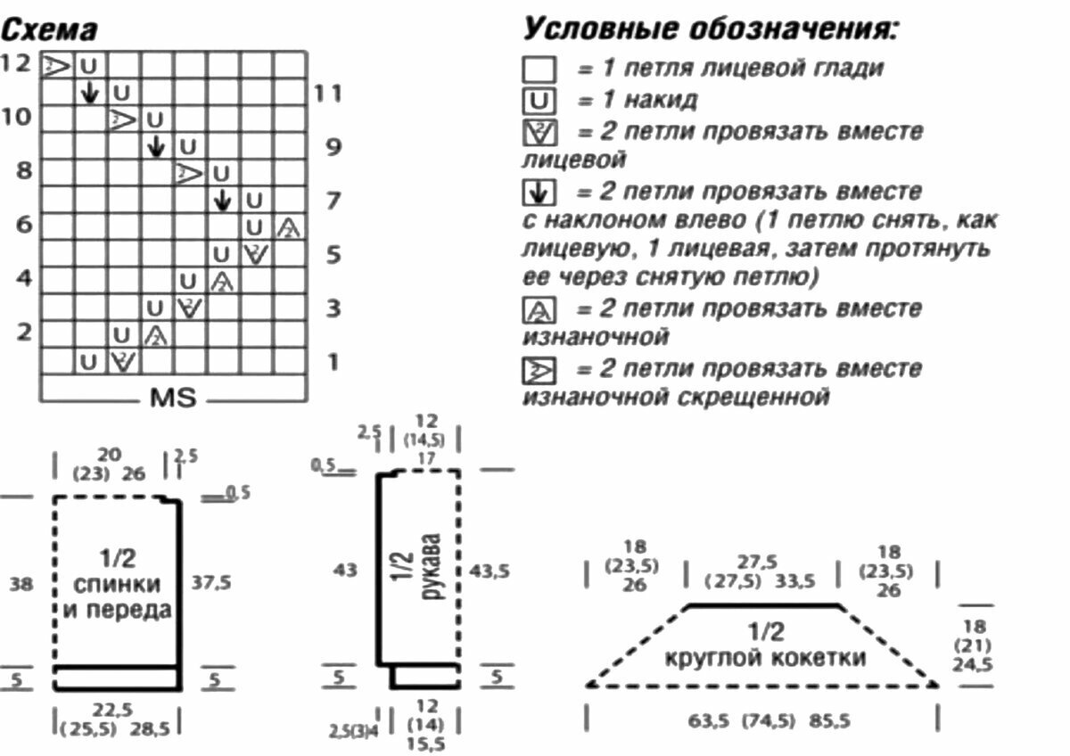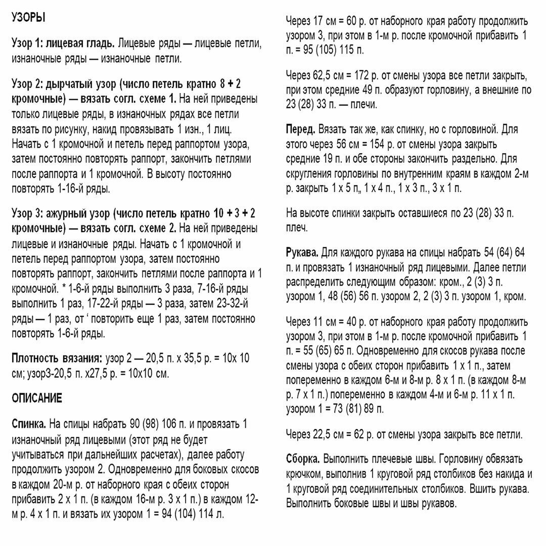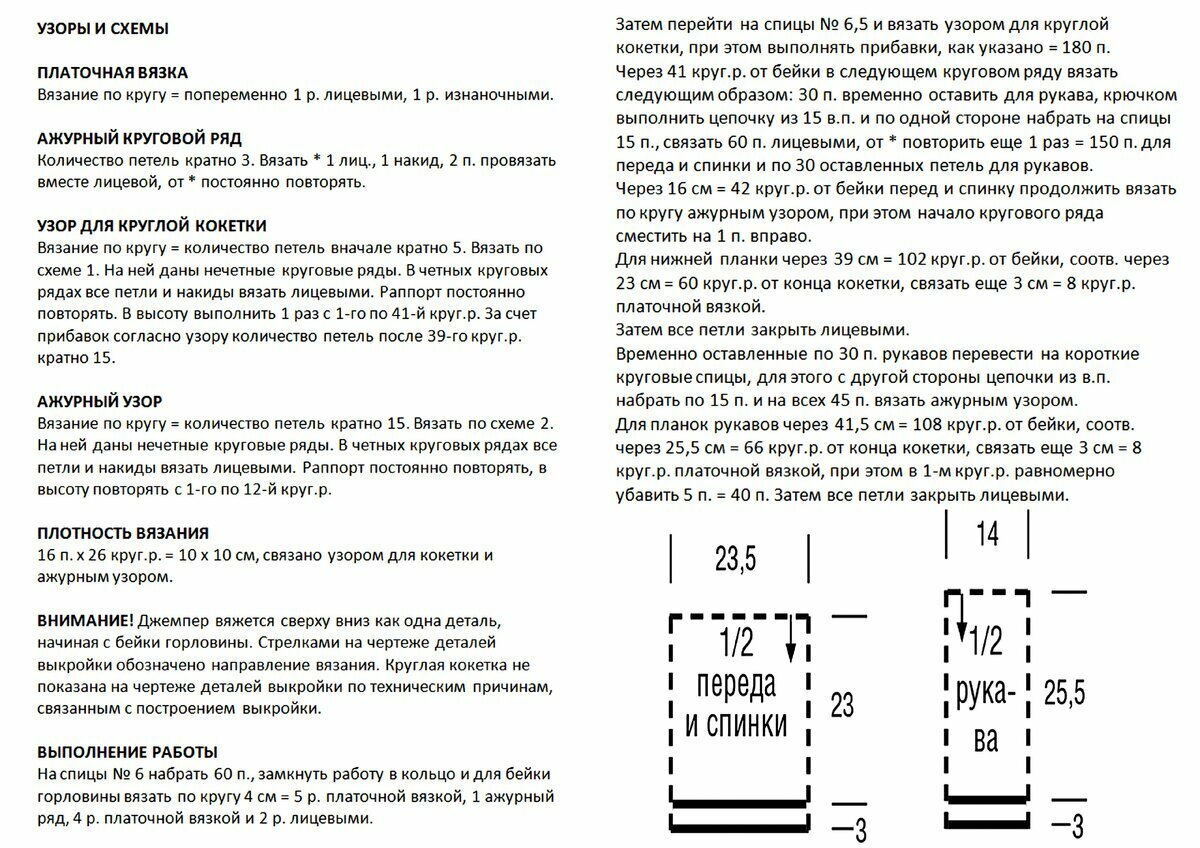 Самое сложное в данной модели — ажурная кокетка. Основная часть джемпера вяжется столбиками с накидом. В качестве отделки можно использовать рельефную резинку, схема к которой приведена в предыдущей модели.
