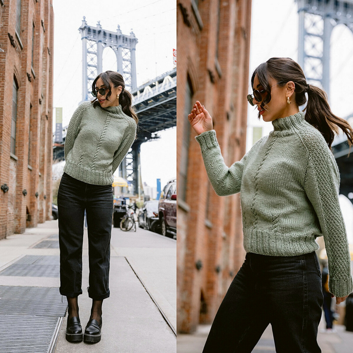 Джемпер связан регланом снизу, интересный и несложный узор из перекрещенных петель.