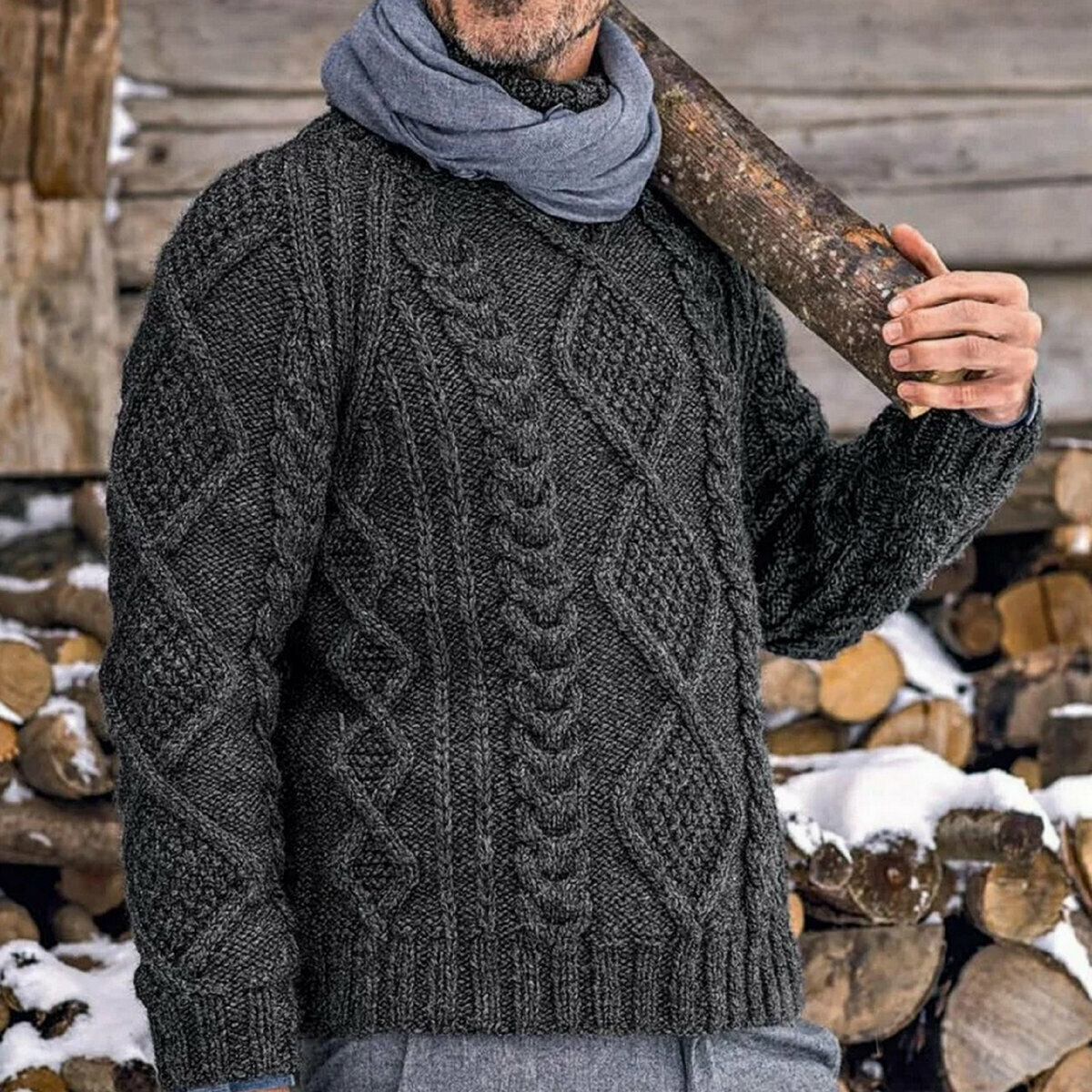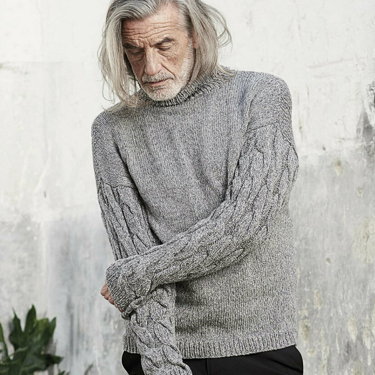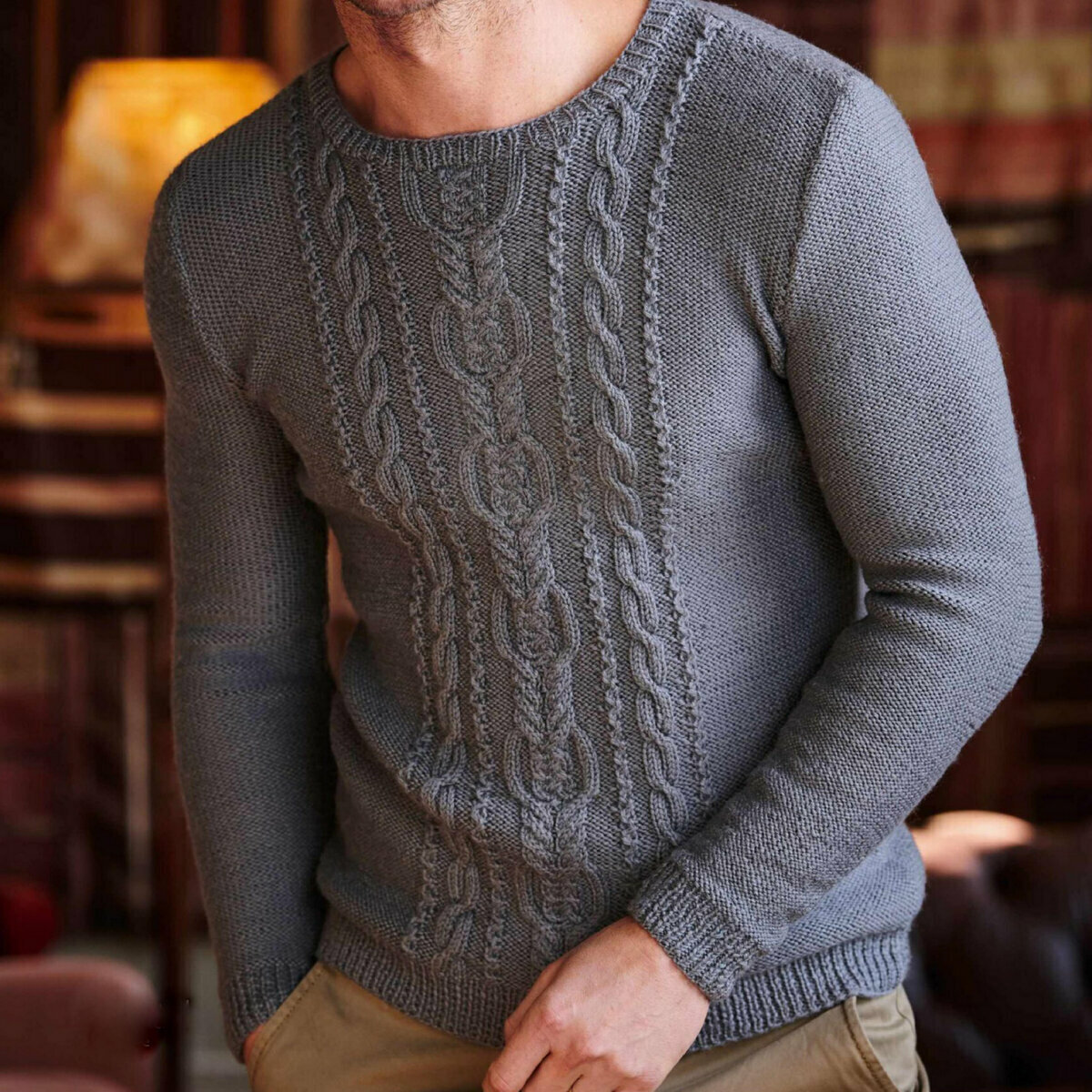 Классический серый джемпер спицами с узором из жгутов и аранов. Наверное, самая популярная мужская модель (я не имею в виду конкретно эту, но фасон и узоры очень распространённые). Араны особенно эффектно смотрятся на сплошном изнаночном фоне.