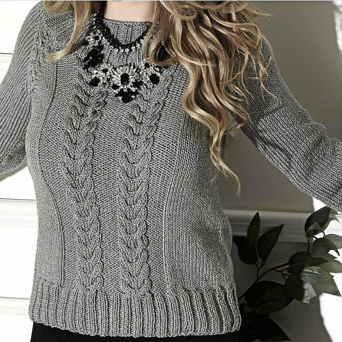 Элегантный светло-серый джемпер спицами с ложными косами — стильная женская модель оверсайз из Бурды.