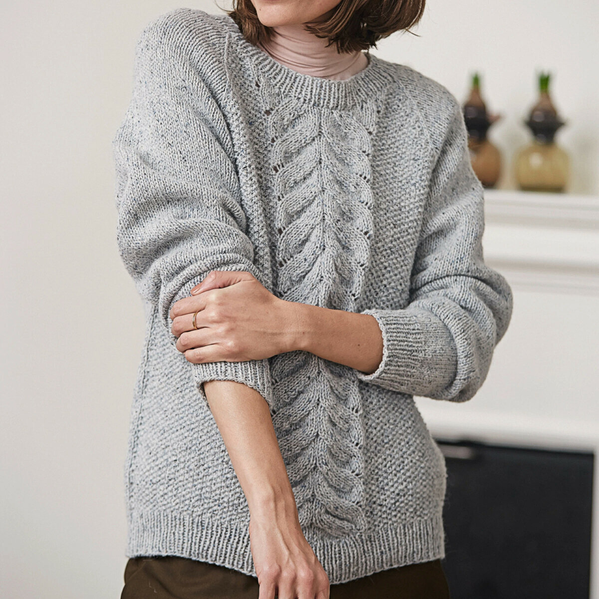 Чтобы связать этот джемпер, нам понадобится 5:6:7:8:8 мотков — на размеры XS:S: М:L:XL соответственно — серой пряжи West Yorkshire Spinners -ColourLab DK (цвет № 037): 100% шерсть; 100 гр — 225 м. Спицы № 3,25 и 4, а также круговые спицы № 3.25 длиной 40 см. Вспомогательные спицы для вязания кос и аранов и контрастная нить.
