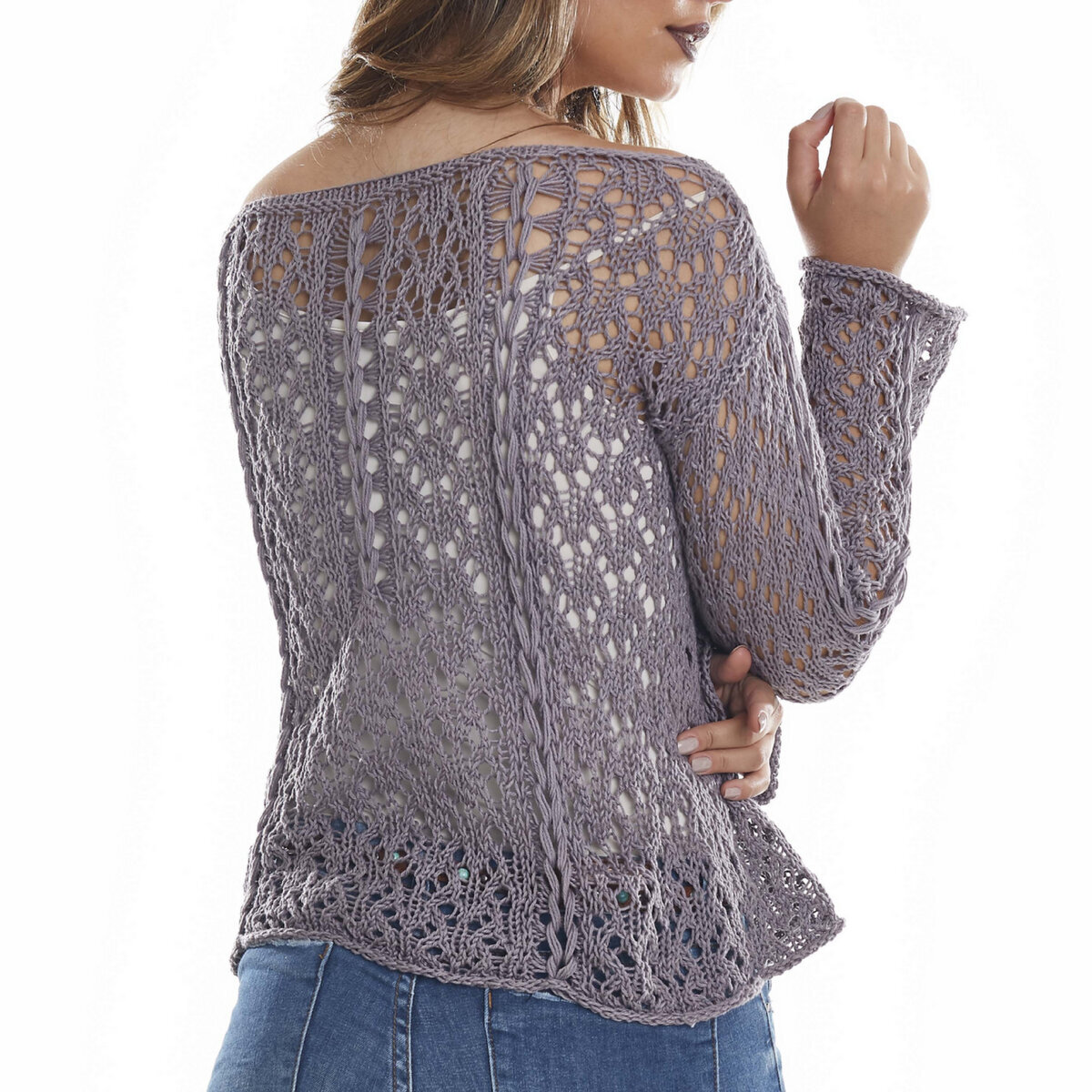 Ажурный джемпер спицами серо-голубого цвета с узором из диагональной сетки и центральной поперечной косы.