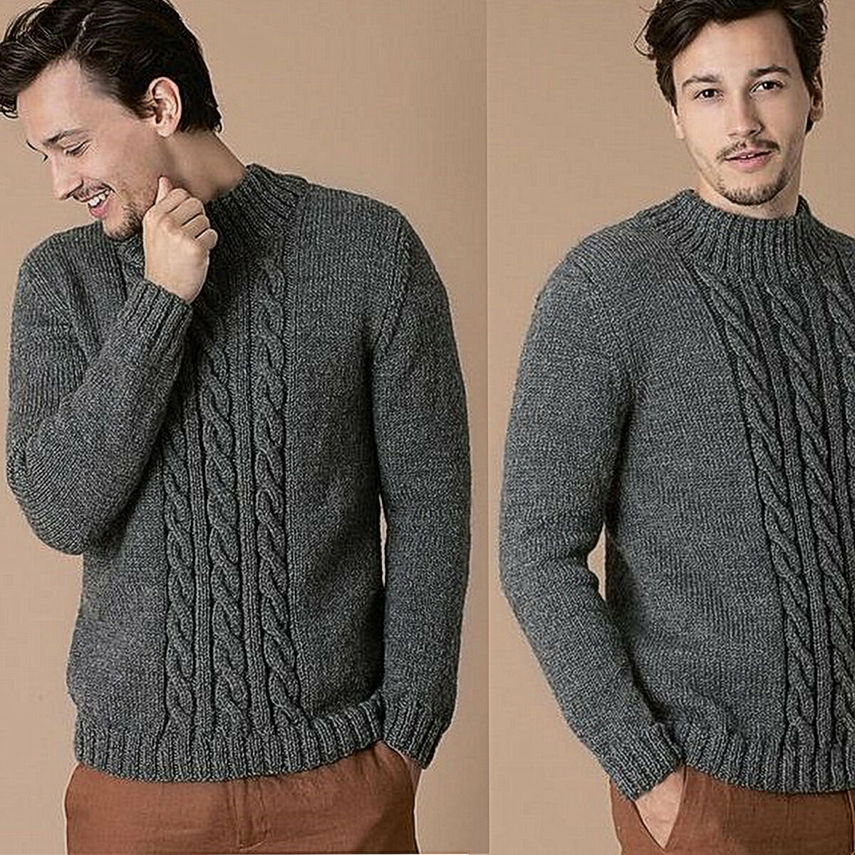 Серо-бежевый джемпер спицами. Модель для мужчины, но при желании можно адаптировать выкройку и под себя — узор вполне универсальный.