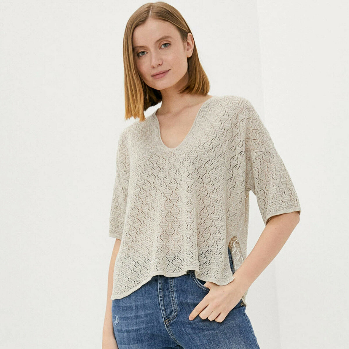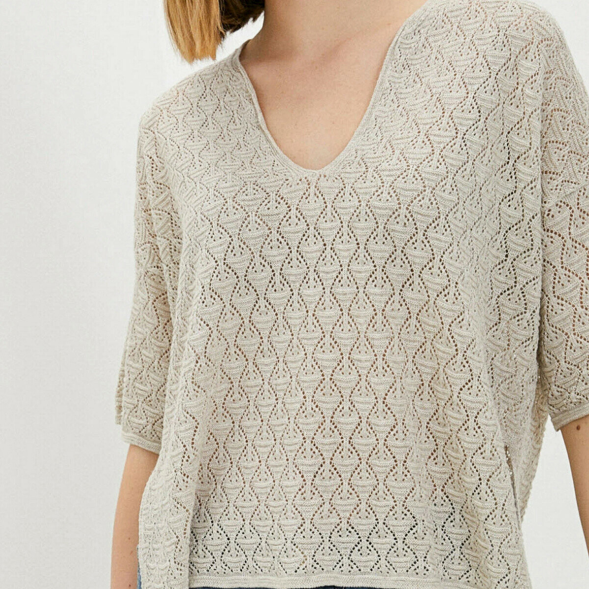 Серо-голубой пуловер спицами свободного кроя с глубоким V-образным вырезом и ажурной вставкой по центру. Прямой фасон до середины бедра, втачной рукав.