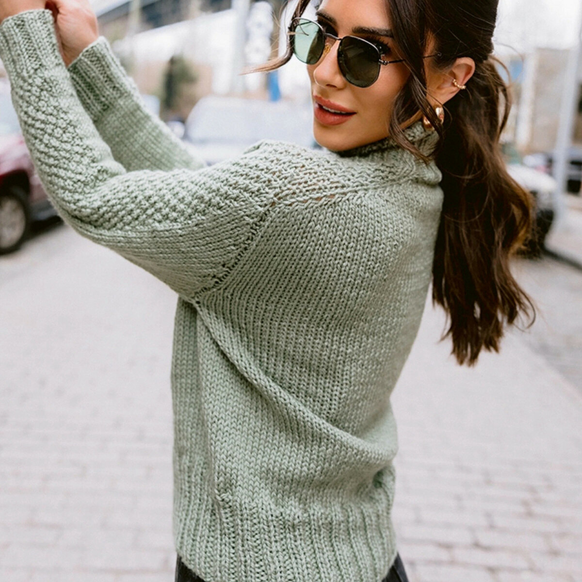 Простой серо-зелёный свитер спицами со вставками в виде рельефных жгутов. Необычный крой, рукав-погон с рисовой путанкой по центру. Слегка укороченный фасон.