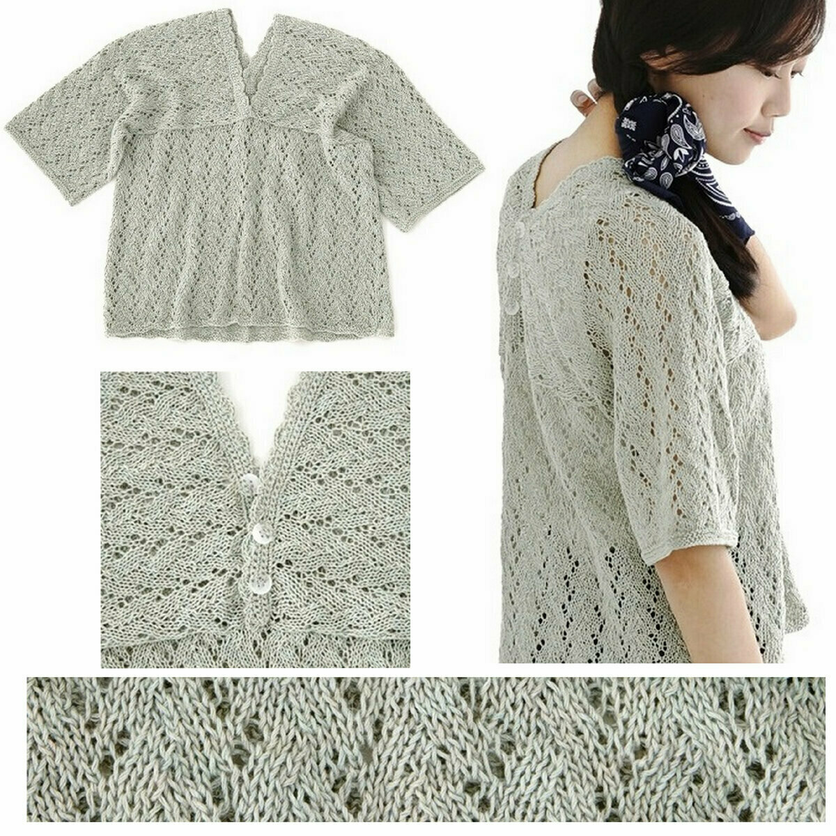 Японский пуловер спицами, застёгивающийся на пуговички сзади. Нежная женская модель, напоминающая кимоно (думаю, неспроста). Просторный фасон-распашонка, свободные рукавчики до локтя и красивый ажурный узор.