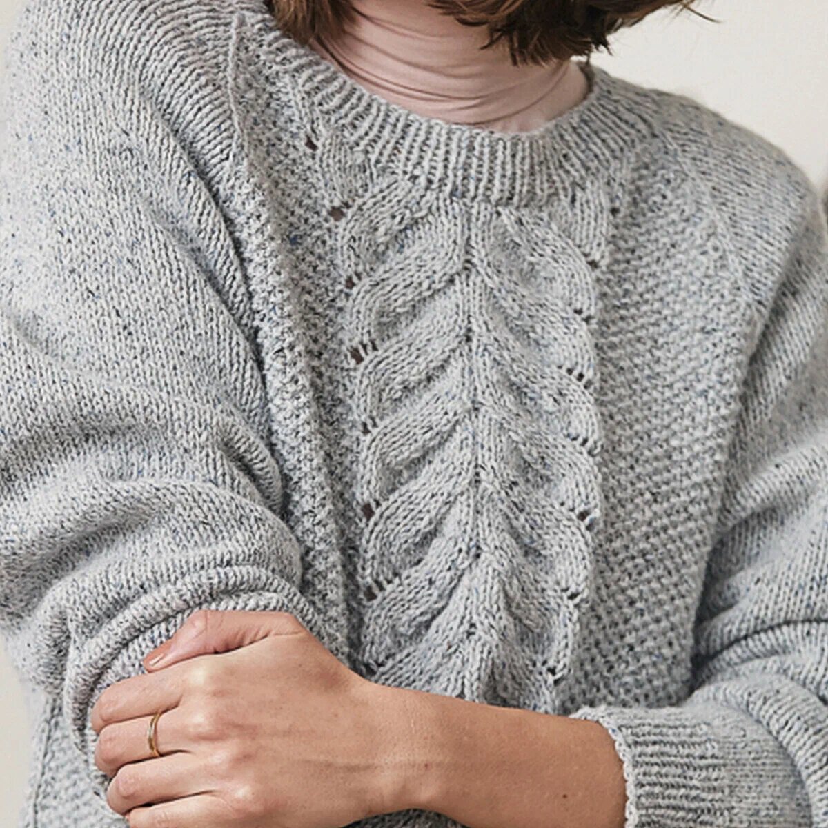 Серый джемпер спицами с простым ажурным узором и косичками из спущенных лицевых петель. Прямой фасон, спущенный широкий рукав и глубокий вырез лодочкой.