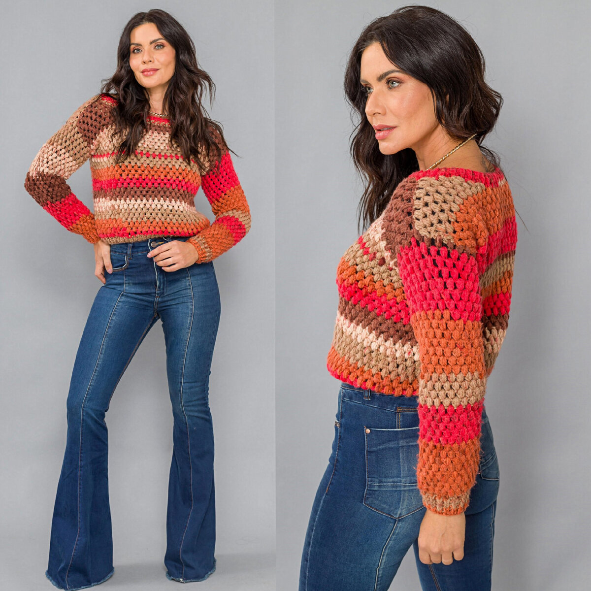 Эффектный джемпер «Попкорн», связанный из яркой секционной пряжи. Слегка укороченный фасон, узкий классический рукав, круглый вырез и оригинальный узор «попкорн» (отсюда и название для самого джемпера).