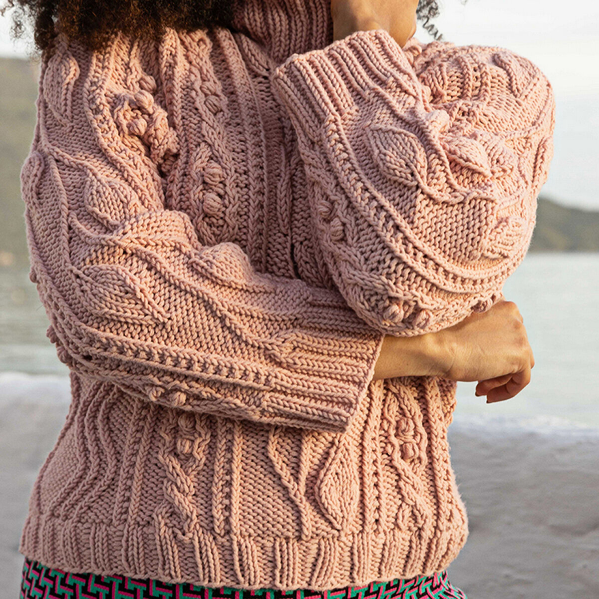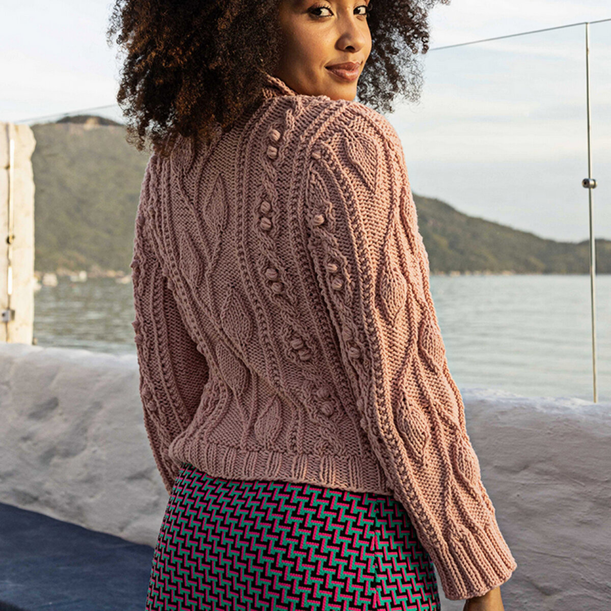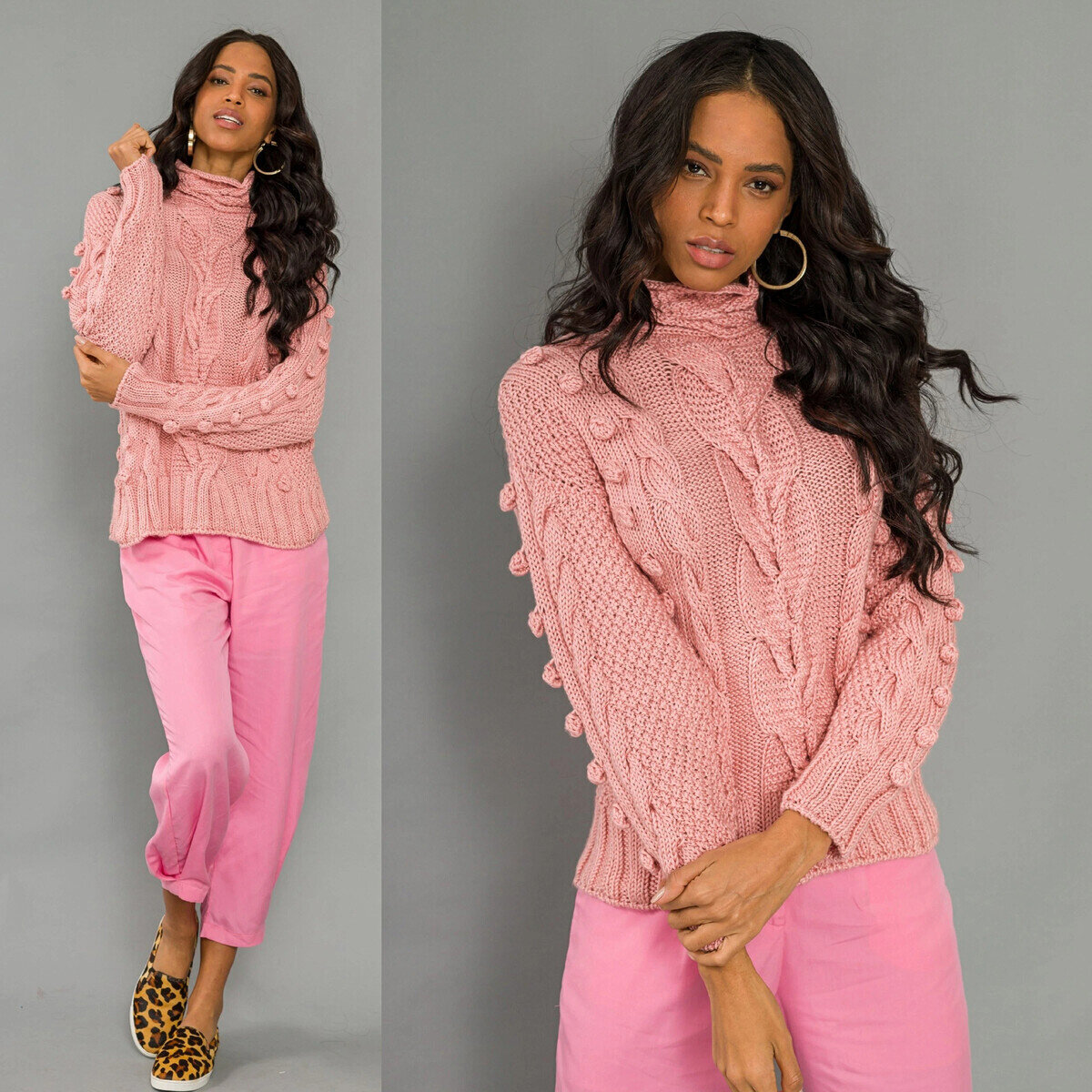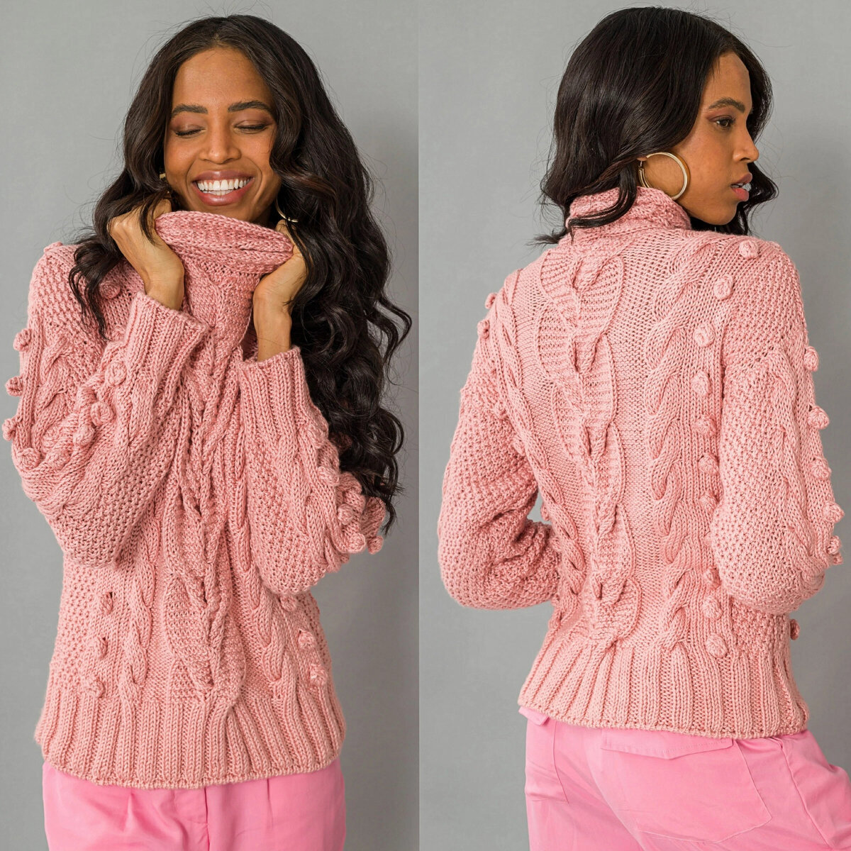 Розовый свитер с крупными косами, жгутами и объёмными шишечками. Эффектная женская модель с рельефными узорами спицами.
