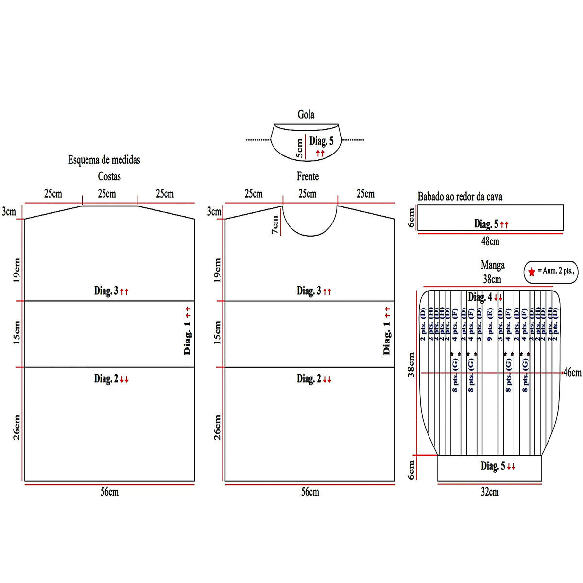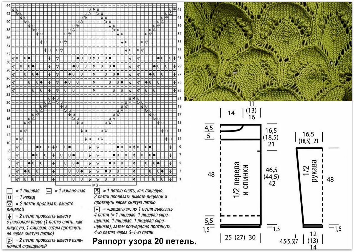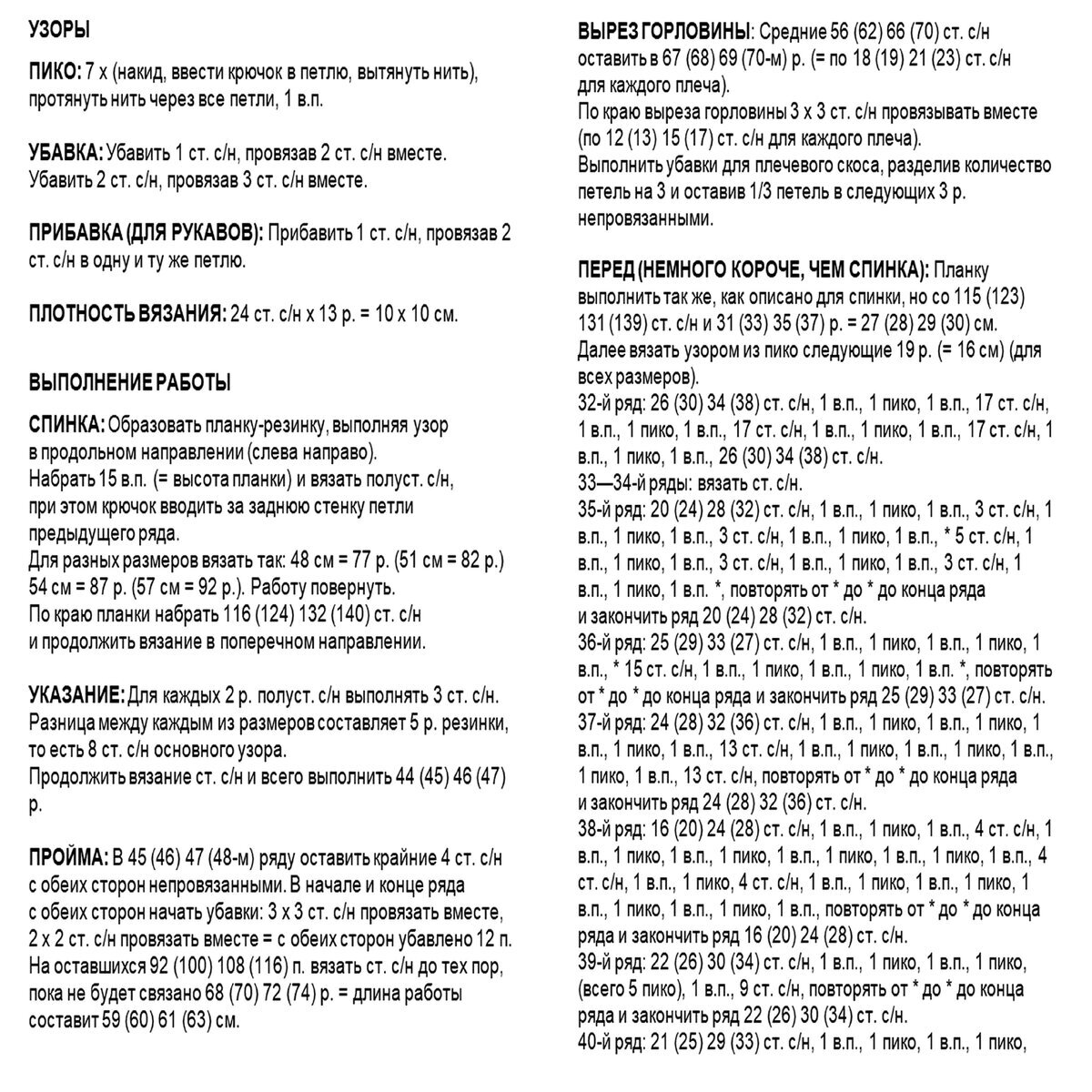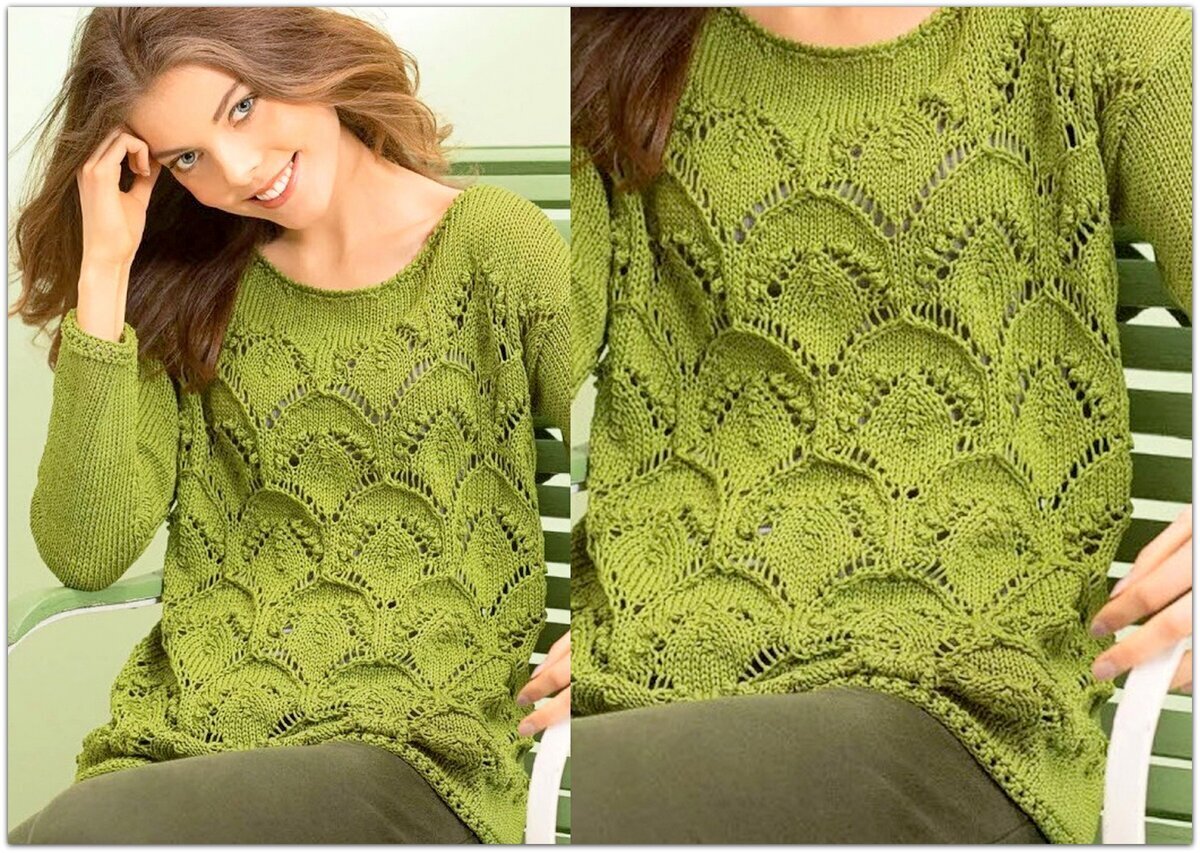 Перед и спинка вяжется прямым квадратом, убавления только под горловину, основным ажурным узором «ромбы», рукава — столбики с накидом. За счёт квадрата рукава получатся немного спущенными. Сами рукава лучше вязать слегка зауженными книзу, постепенно убавляя по краям петли. Но можно обойтись и без постепенного заужения — сейчас очень модны рукава-фонарики: вяжете широкий рукав, а в конце убавляете сразу много петель (например, каждую 5-ю петлю, зависит от ширины рукава) и вяжете манжет-резинку.