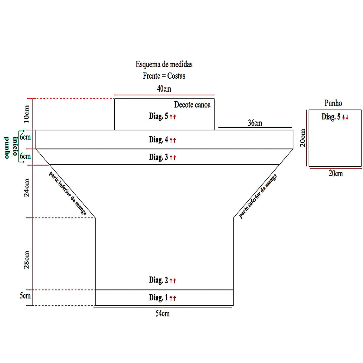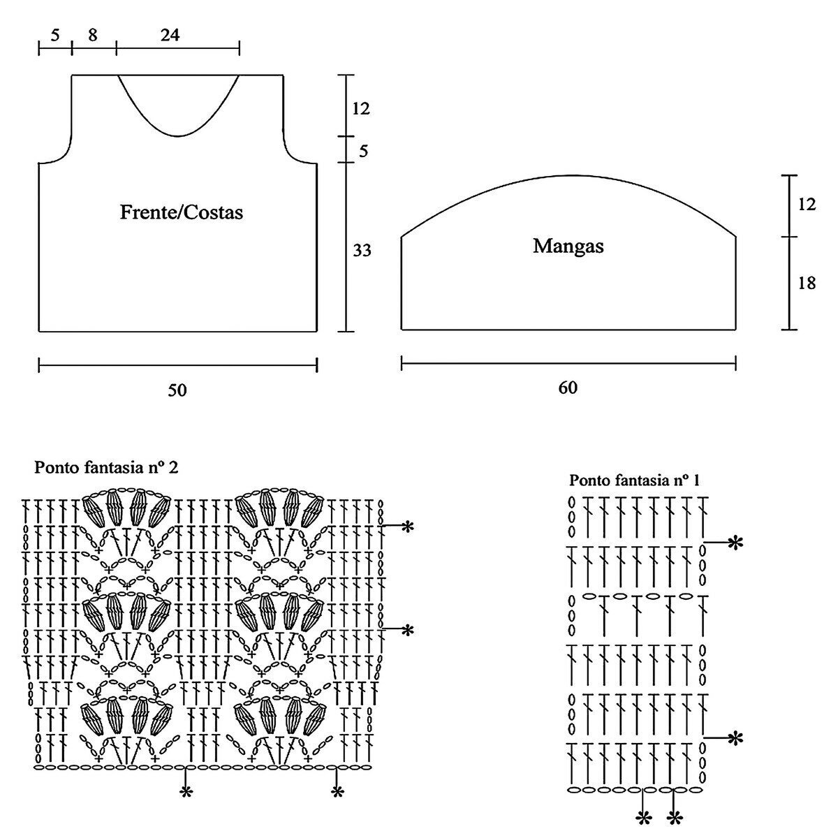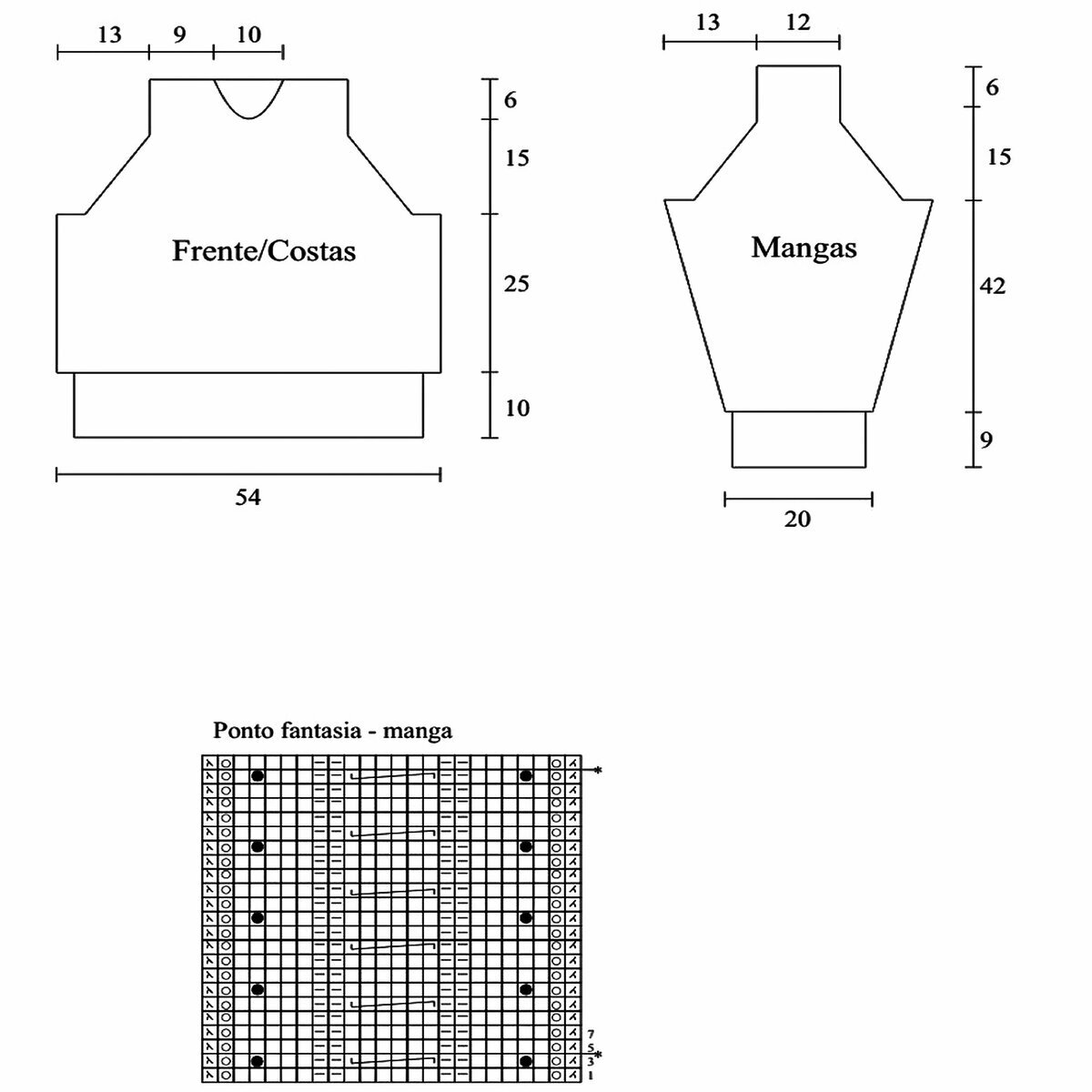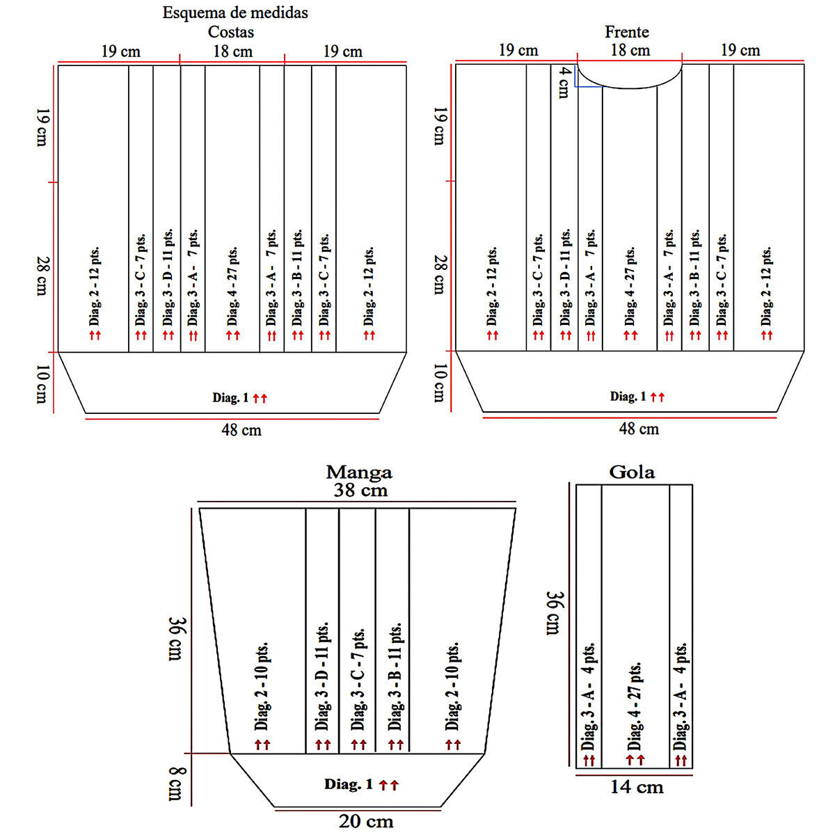 Перед и спинка вяжется прямым квадратом, убавления только под горловину, основным ажурным узором «ромбы», рукава — столбики с накидом. За счёт квадрата рукава получатся немного спущенными. Сами рукава лучше вязать слегка зауженными книзу, постепенно убавляя по краям петли. Но можно обойтись и без постепенного заужения — сейчас очень модны рукава-фонарики: вяжете широкий рукав, а в конце убавляете сразу много петель (например, каждую 5-ю петлю, зависит от ширины рукава) и вяжете манжет-резинку.