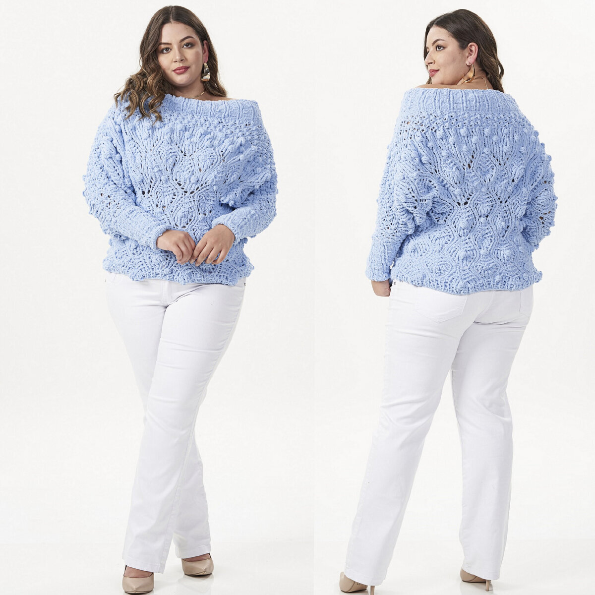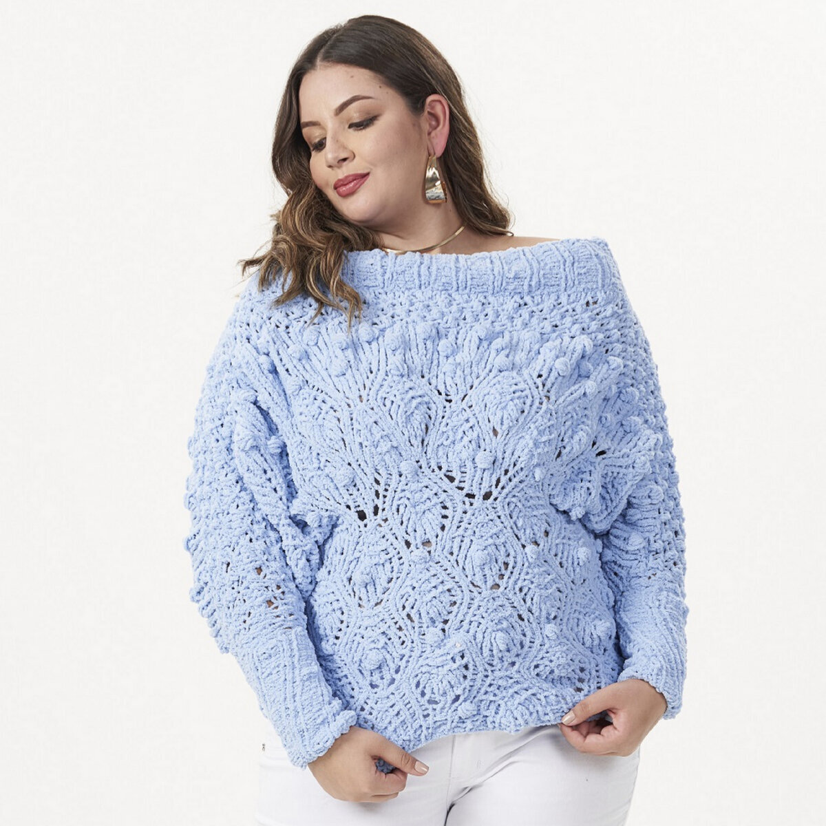 Голубой свитер плюс-сайз. Женская модель оверсайз с интересным фасоном а-ля летучая мышь — рукава вяжутся одновременно с передом и спинкой, путём прибавления петель по краям. Глубокий вырез горловины на широкой резиночке делает образ особенно притягательным. Ну и мои любимые объёмные шишечки!