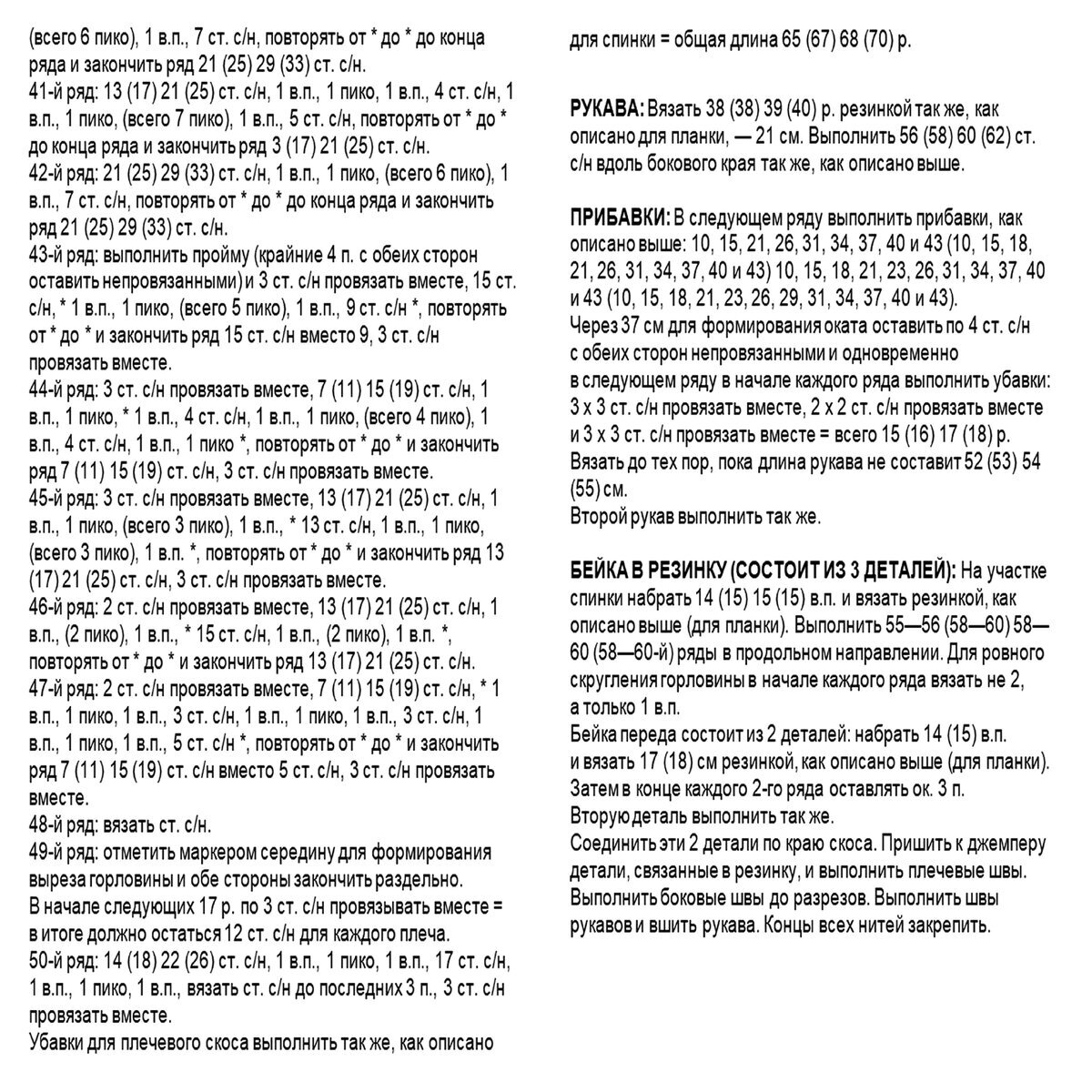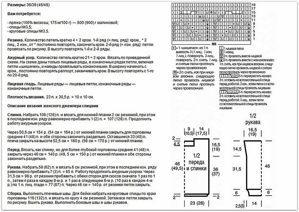 Самое сложное в данной модели — ажурная кокетка. Основная часть джемпера вяжется столбиками с накидом. В качестве отделки можно использовать рельефную резинку, схема к которой приведена в предыдущей модели.