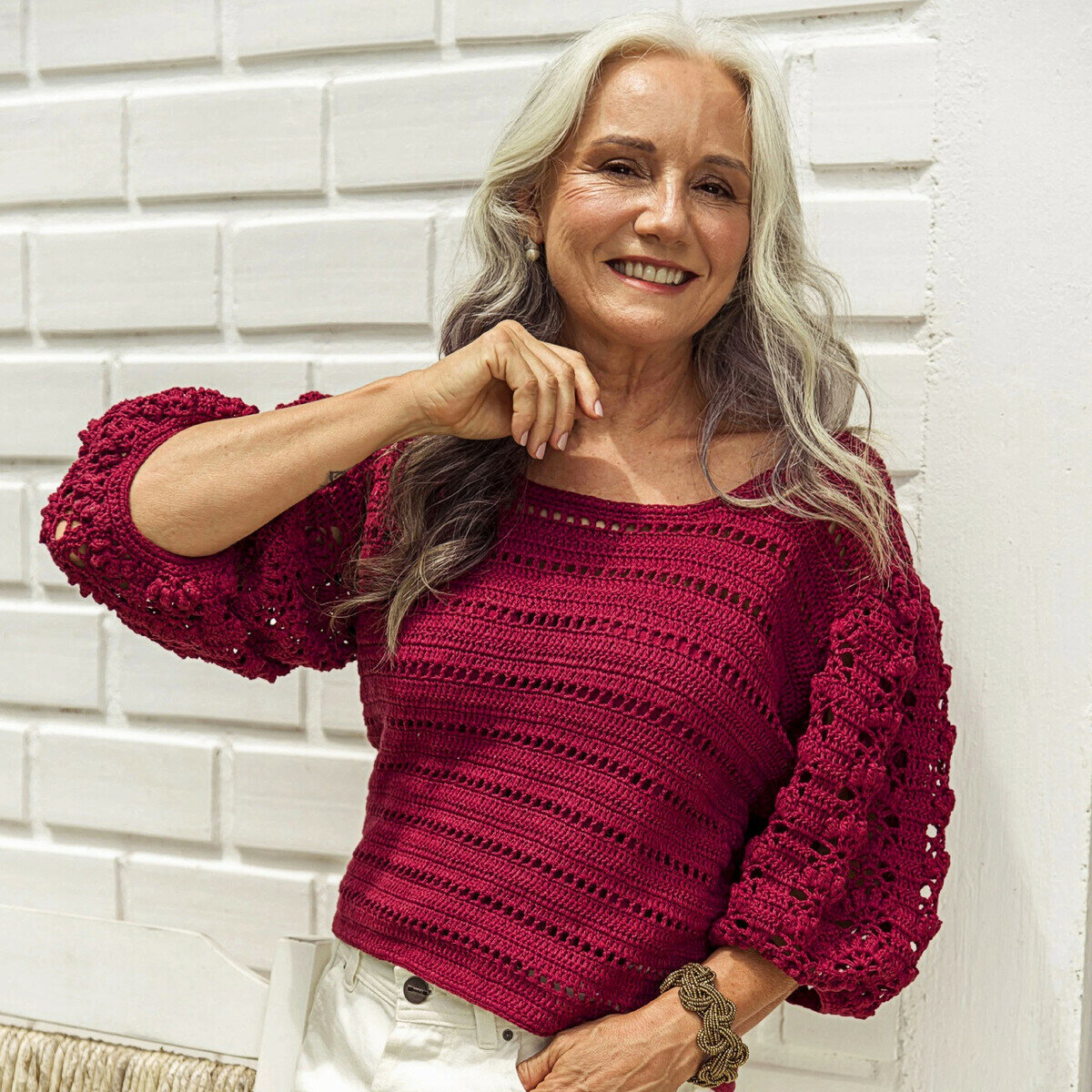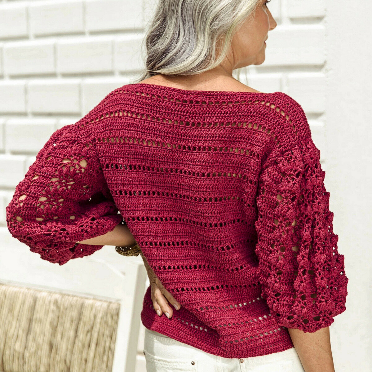 Нарядный вишнёвый джемпер свободного кроя с широкими рукавчиками три четверти на узкой манжете. Стильная модель насыщенного цвета. Основной узор джемпера — столбики с накидом, чередующиеся с редкими ажурными дорожками, пышные рукава украшены ажурным фантазийным узором.