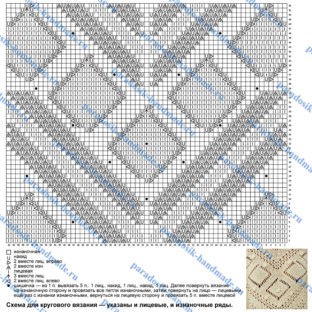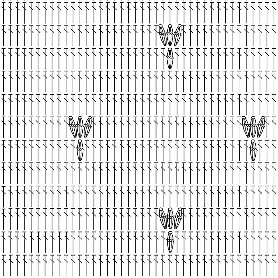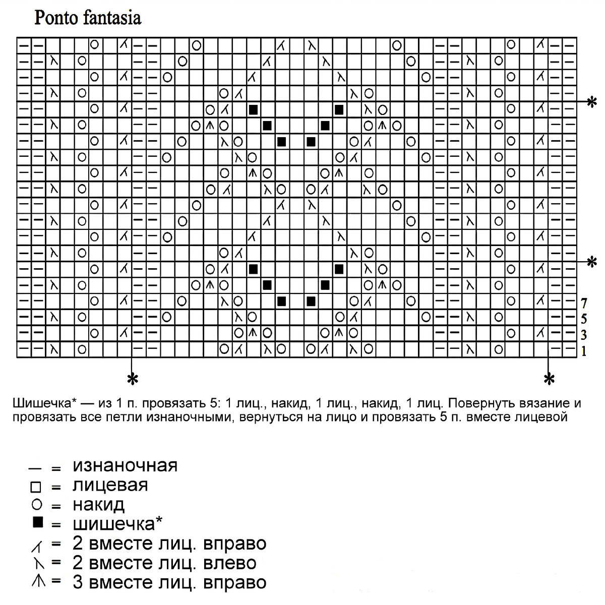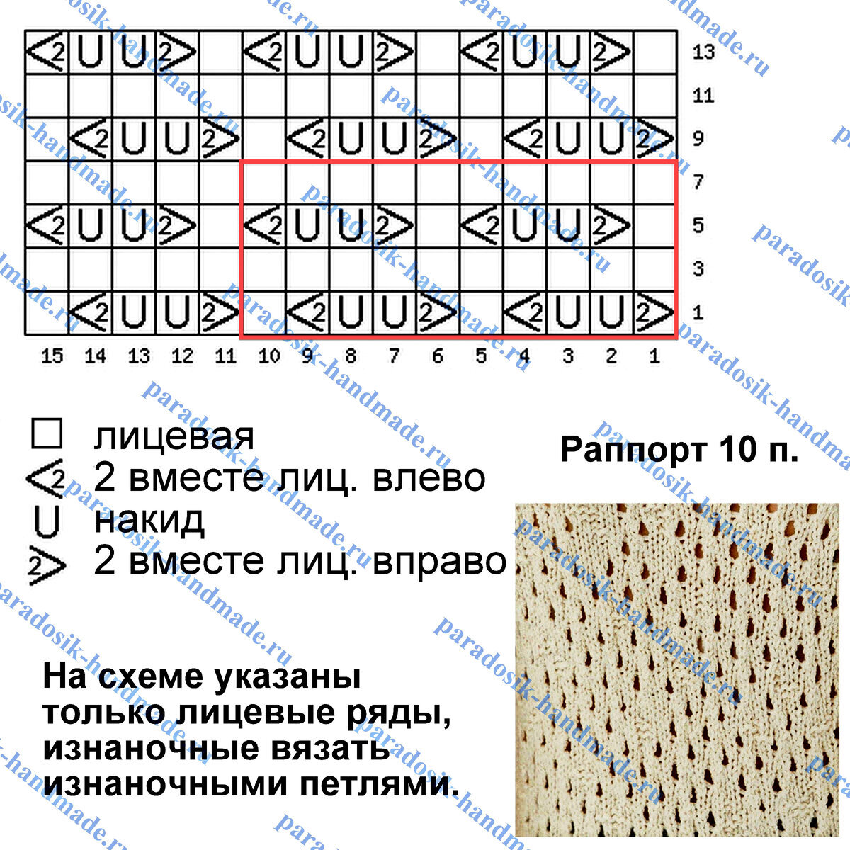 Раппорт узора 10 петель и 8 рядов в высоту. На схеме указаны только лицевые (нечётные) ряды, изнаночные (чётные) вязать изнаночными петлями.