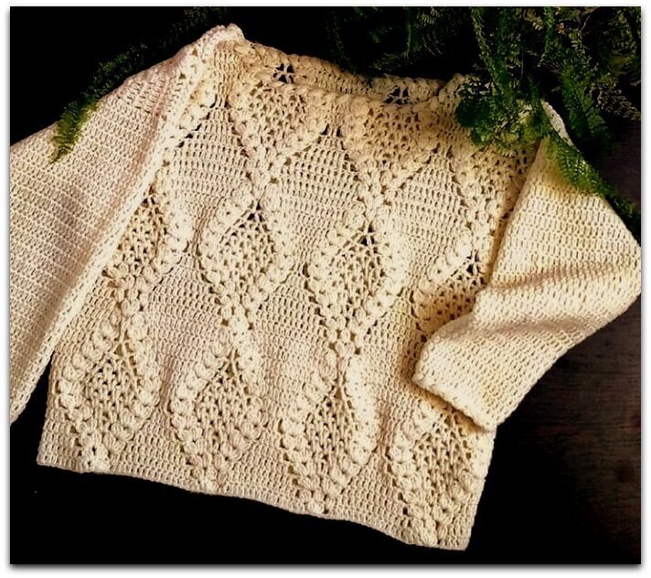 Светло-бежевый джемпер с интересным узором «ромбы». Оригинал на фото (автора потеряла) связан крючком из пряжи Alize Lanagold Fine (49% шерсть, 51% акрил / 100 гр — 390 м), но для лета можно подобрать более лёгкую ниточку, например, мягкий хлопок с акрилом — Alize Cotton Gold Fine (55% хлопок, 45% акрил / 100 гр — 660 м).