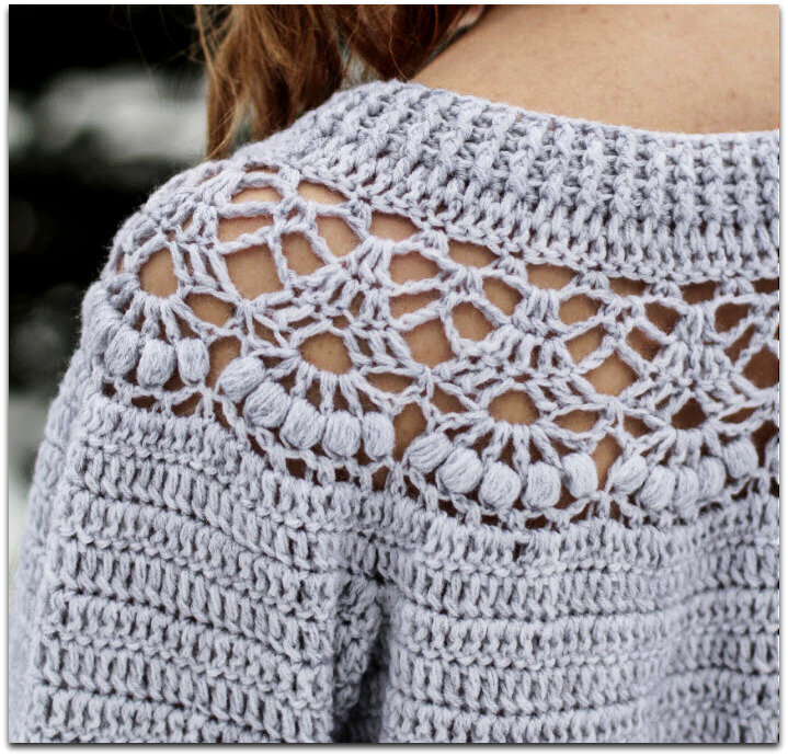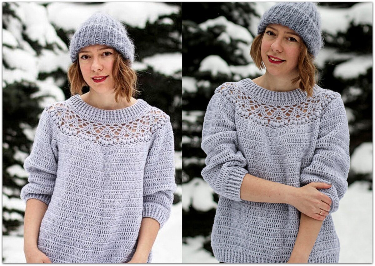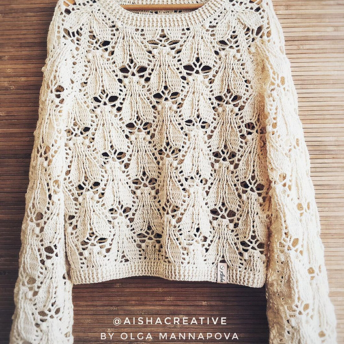 Даже я, мало вяжущая крючком, загляделась на этот необычный фасон с простыми, казалось бы, узорами. Мне очень нравится идея такого оформления. Как-нибудь попробую сделать похожий свитер спицами.