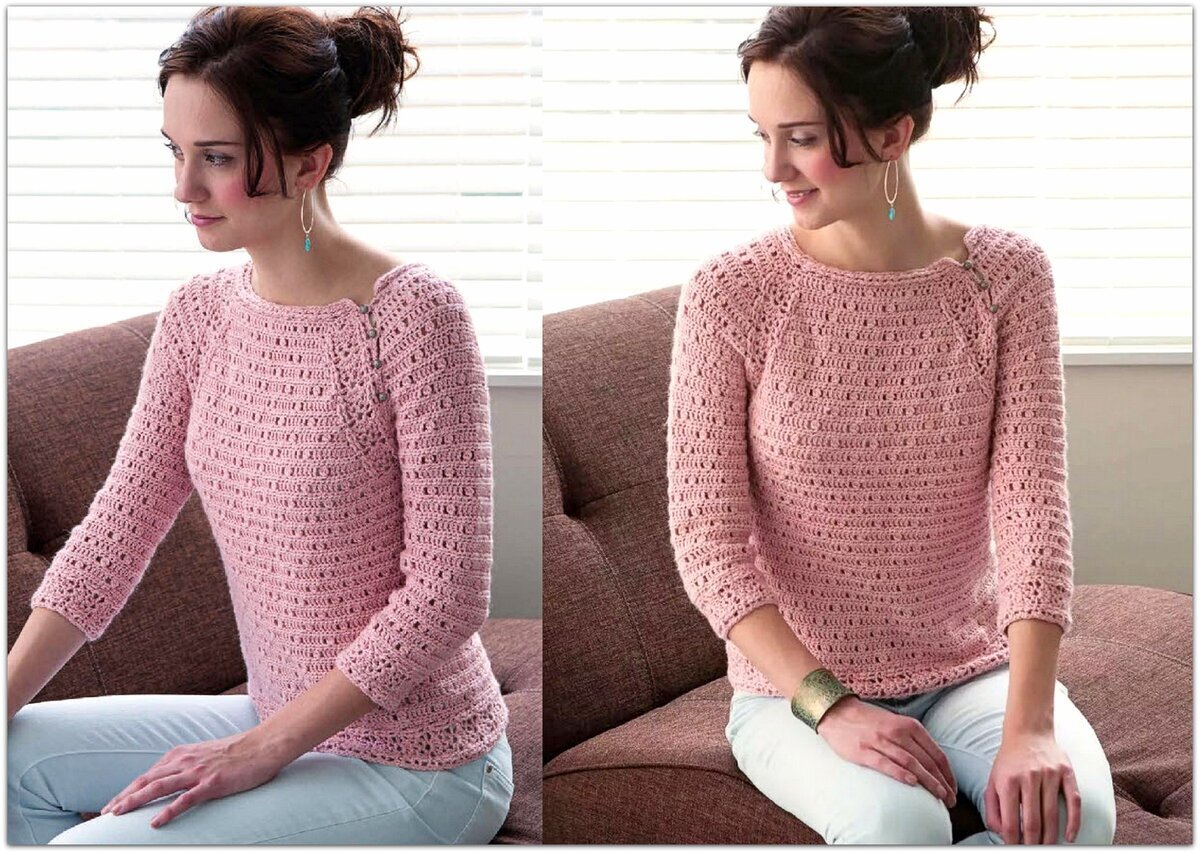 Романтический джемпер пастельно-розового цвета для самых нежных дам. Элегантно застёгивается с одной стороны на пуговички, в районе ажурной линии реглана.
