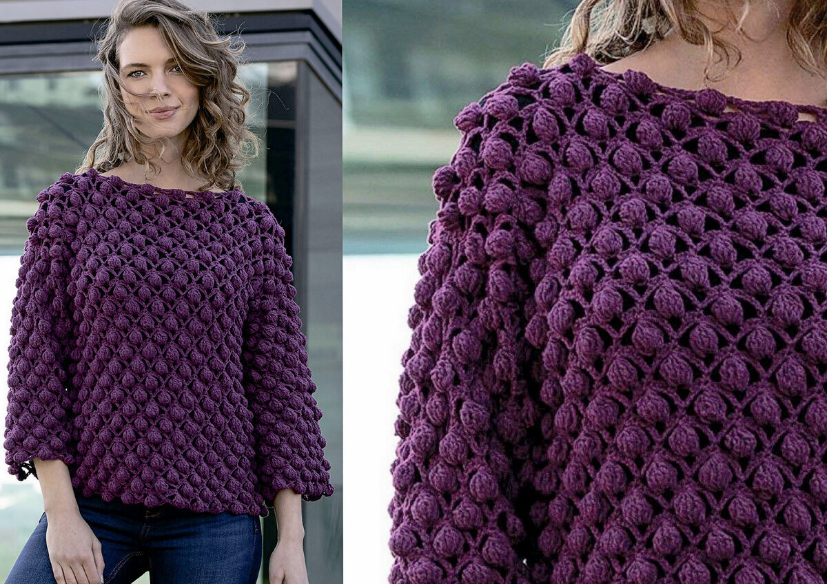 Оригинальная объёмная модель из журнала Burda — стильный фиолетовый джемпер с узором из крупных шишечек. Хоть я и очень люблю такие объёмные узоры, всё же шишечки б делала поменьше — они добавляют не только объёма (и веса) изделию, но ещё и объёма фигуре. На очень худеньких девочках будет смотреться хорошо, а вот на девушке с формами… В любом случае, идея интересная.