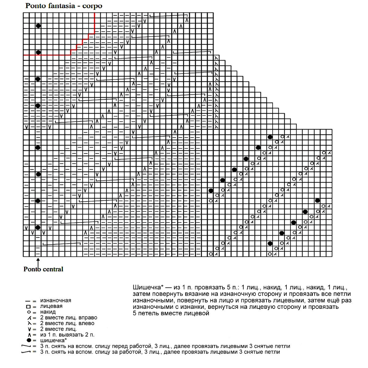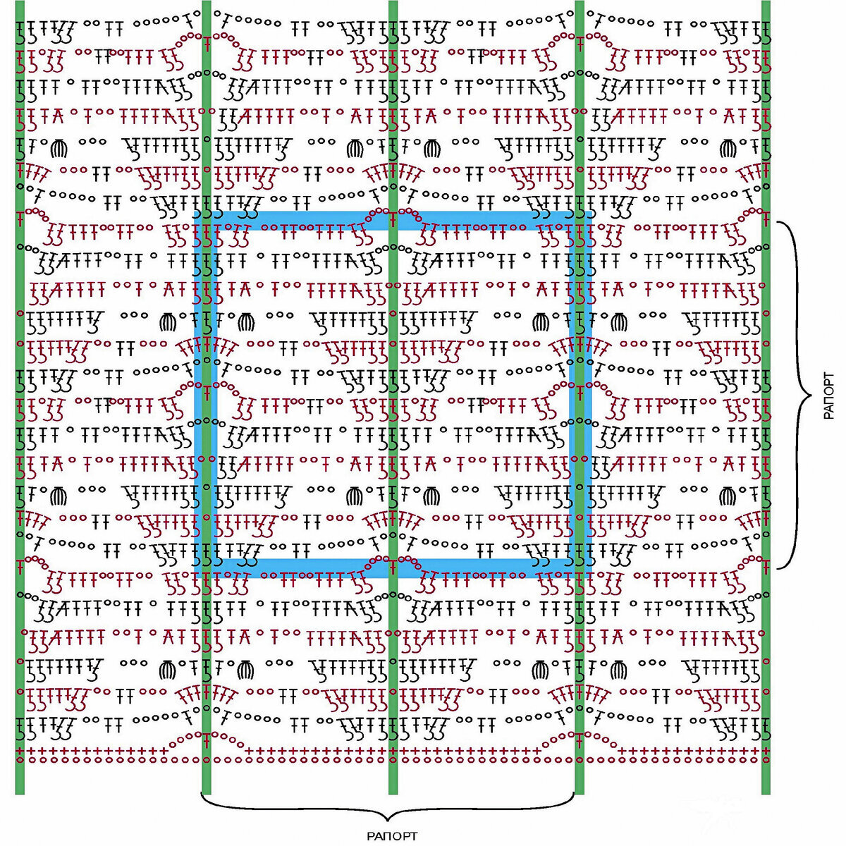Основной ажурный узор свитера, который идёт у нас впереди и на рукавах. Выделить здесь какой-то небольшой раппорт невозможно было, поэтому я составила схему для центральной части.