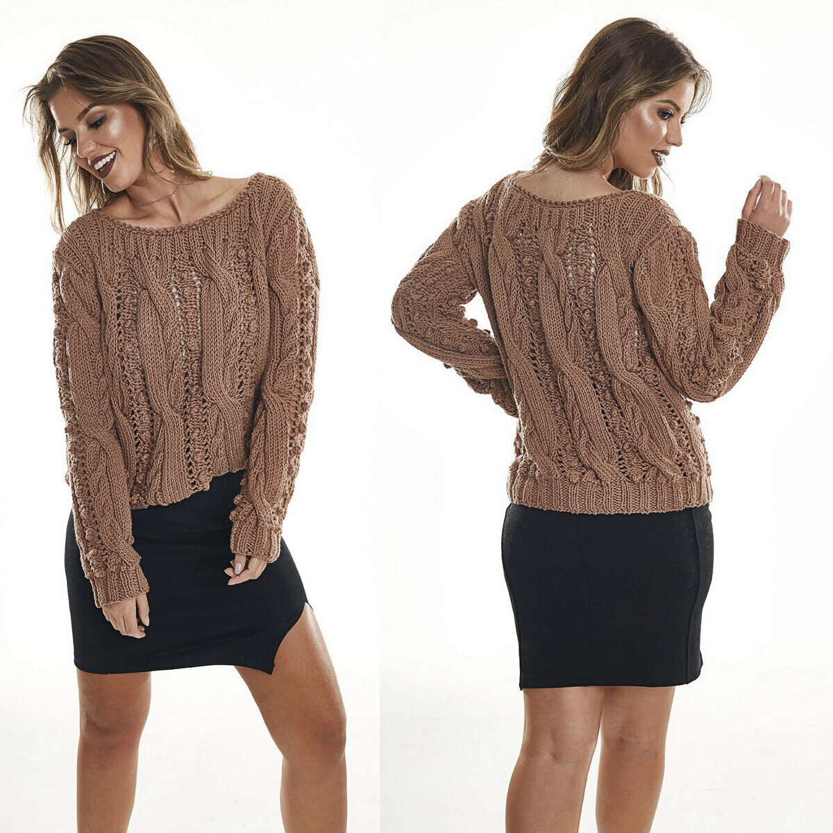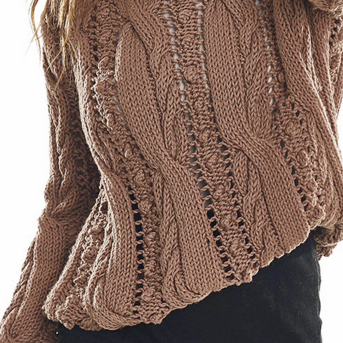 Кофейный свитер свободного кроя с объёмным узором из оригинальных крупных жгутов, включающих в себя красивую цепочку жгутов меньше. Между жгутами идёт ажурная сетка, украшенная крупными шишечками из изнаночной глади.