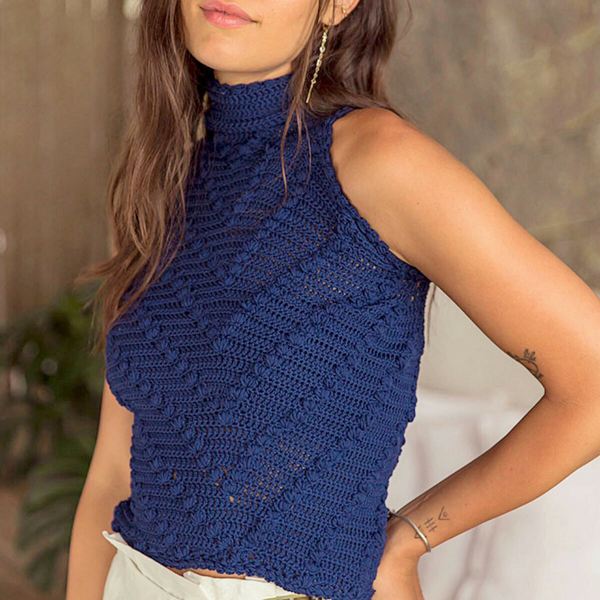 Стильный синий топ с диагональным узором из шишечек. Отличная универсальная модель, которая будет одинаково хорошо смотреться как на отдыхе — под пляжные шорты или юбку, — так и в офисе, со строгими брюками.