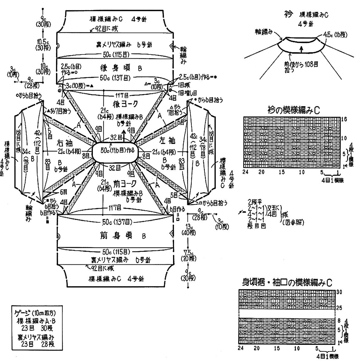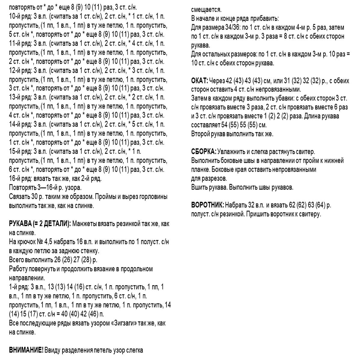 Здесь фабричный (сшивной) реглан — все детали идут отдельно, но вы можете связать этот свитер регланом сверху либо снизу, как вам больше нравится. Модель, конечно, непростая! Во многом, за счёт геометрического узора, который надо грамотно расположить на свитере. Резинка внизу, на манжетах и вороте-стойке — 2 х 2 (2 лиц., 2 изн.)