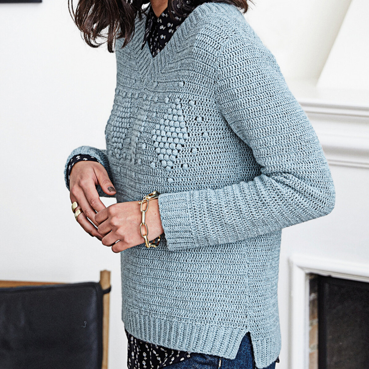 Симпатичный голубой пуловер, связанный обычными столбиками с накидом. Изюминка модели — центральные ромбы из объёмного «попкорна». Прямой крой, втачной рукав, V-образный вырез горловины, слегка удлинённая спинка и небольшие боковые разрезы.