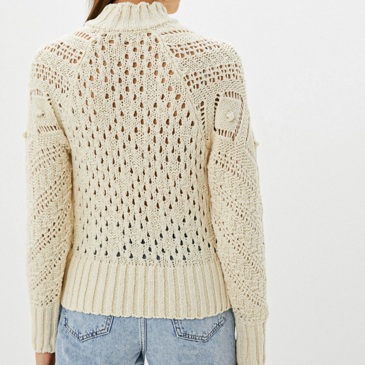 Нежный пудровый свитер с оригинальным фантазийным узором — тут тебе и объёмные шишечки из пышных столбиков, и араны, и рельефные листочки. Прямой фасон до пояса, втачной рукав и высокий ворот.