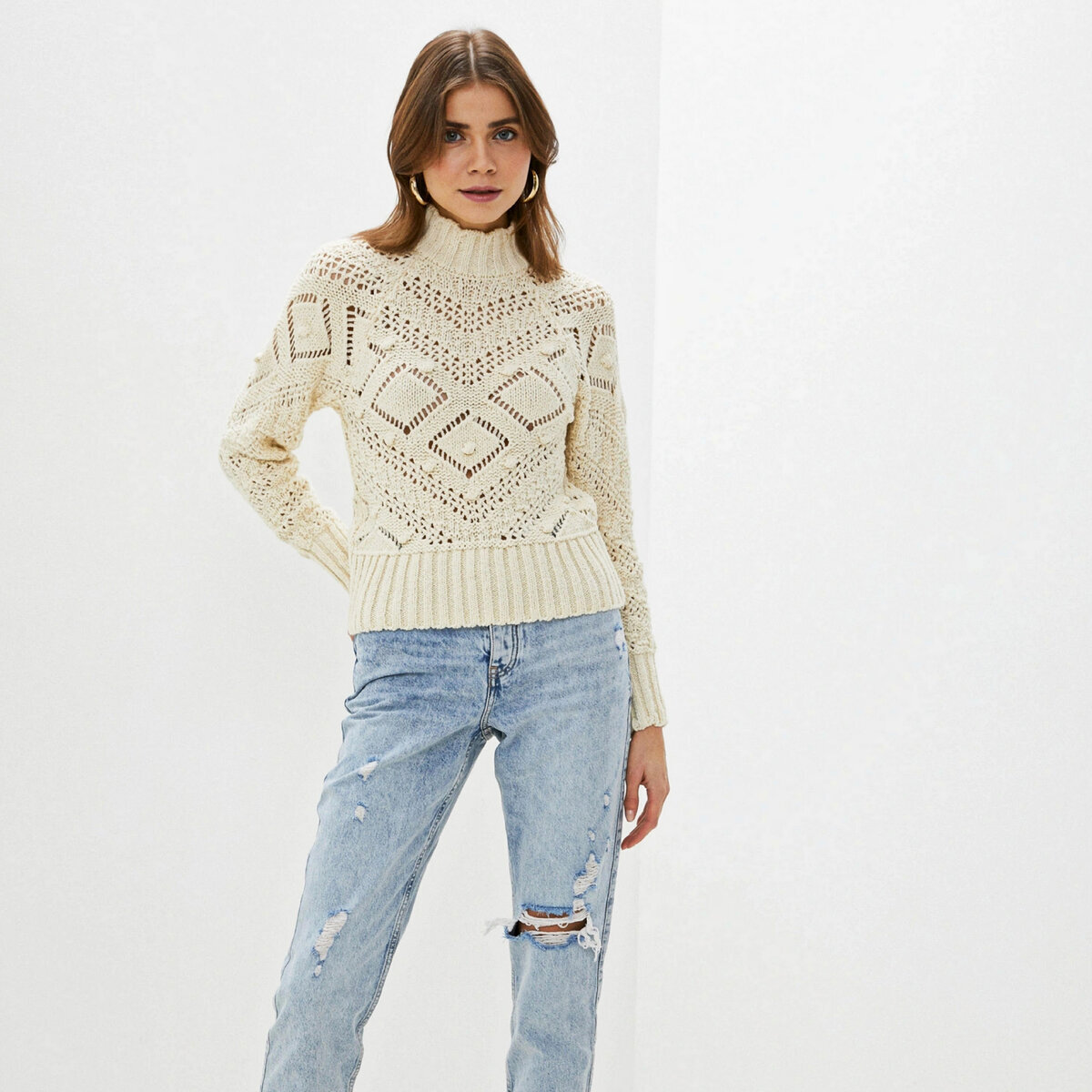 Футуристический свитер River Island натурально-белого цвета. Необычная и стильная модель с интересным геометрическим рисунком. Прямой, слегка облегающий фасон, рукава-реглан и высокий ворот-стойка делают этот свитер особенно изысканным!