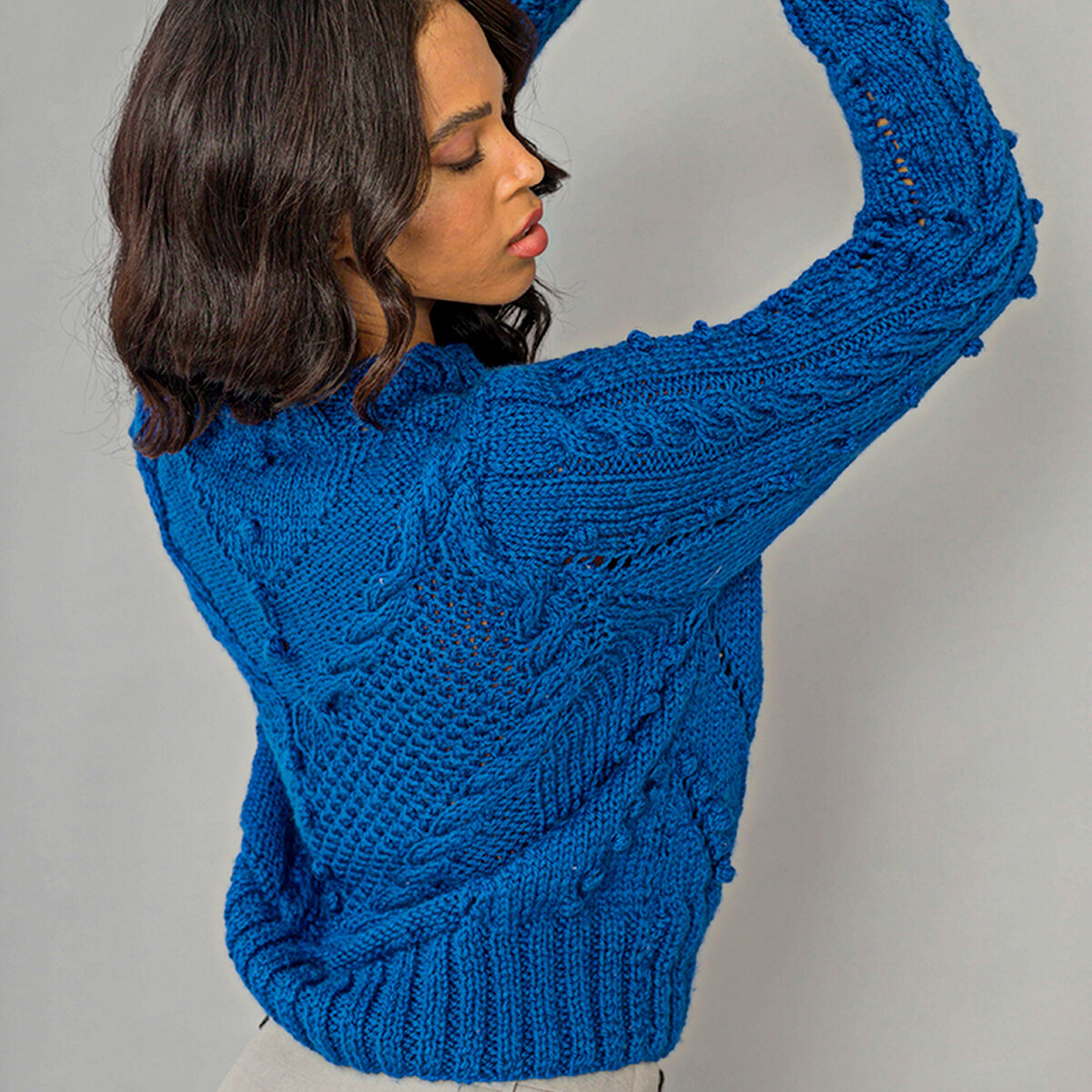 Нарядный васильковый свитер с непростыми, но интересными узорами — сочетание диагональных кос, рисовой путанки, ажура и объёмных шишечек. Модель свободного кроя, прямой фасон, втачной рукав и круглый вырез горловины.