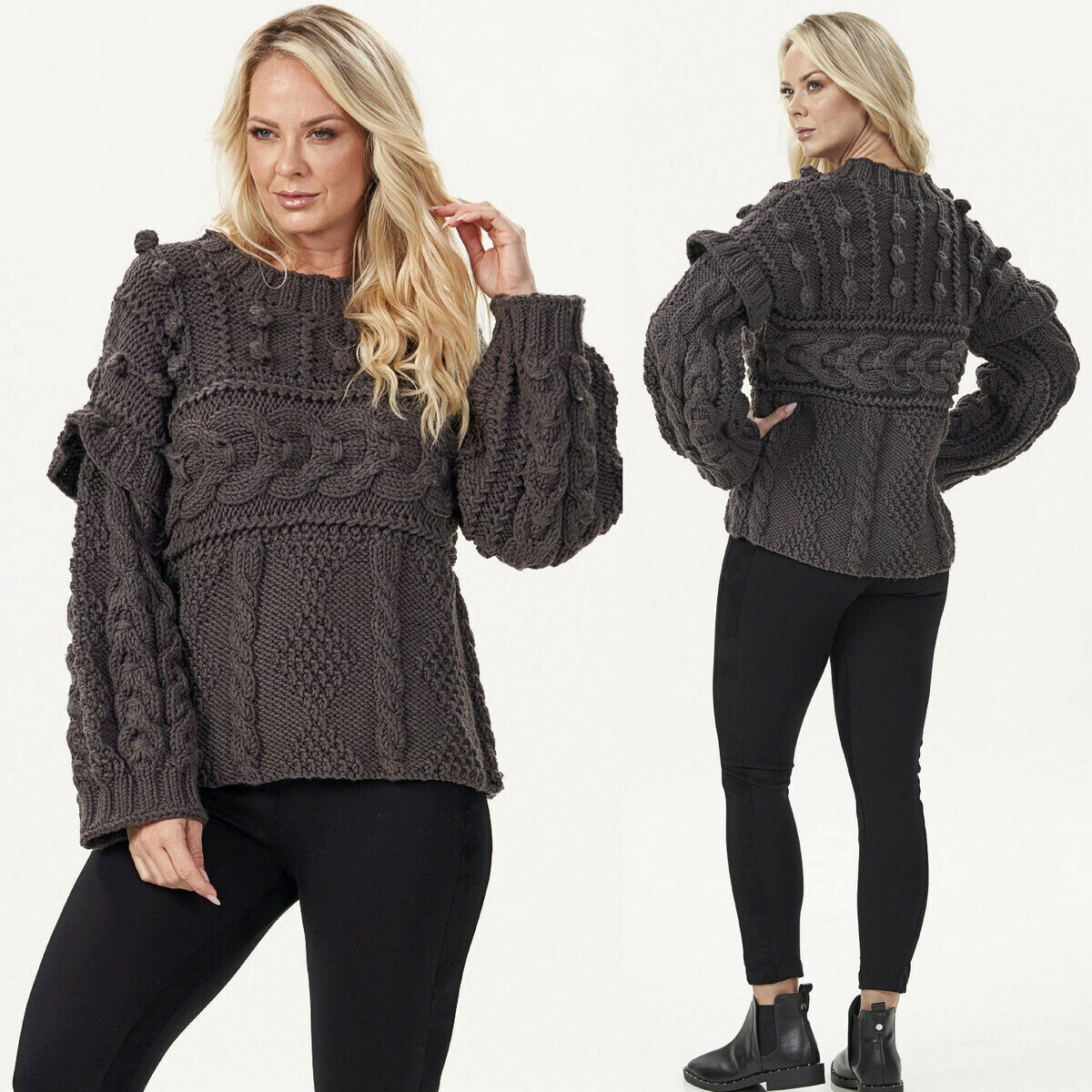 Оригинальный объёмный свитер спицами. Женская модель оверсайз с крупными шишечками, рельефными жгутами и поперечной косой. И главная изюминка данного свитера — «крылышки» на рукавах!