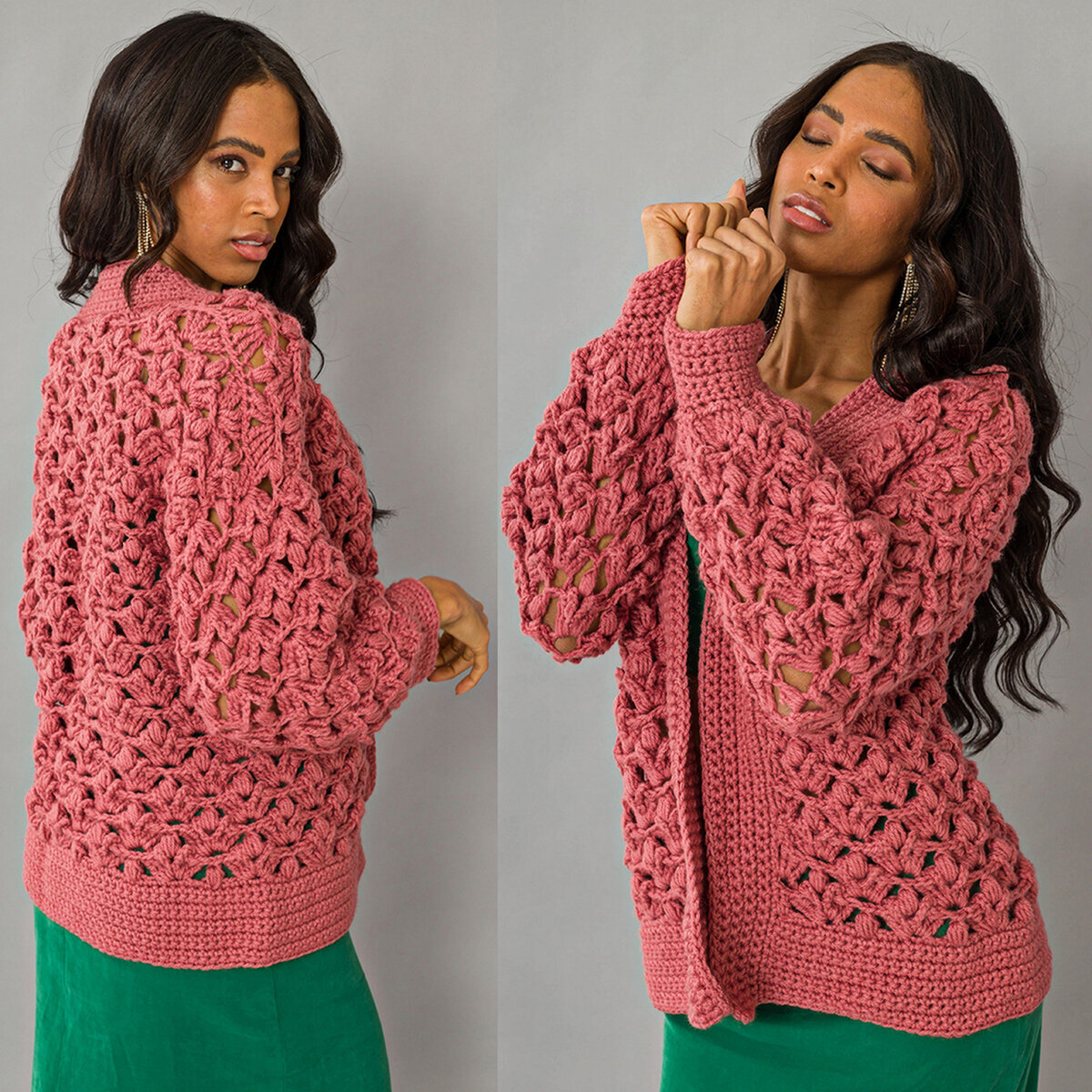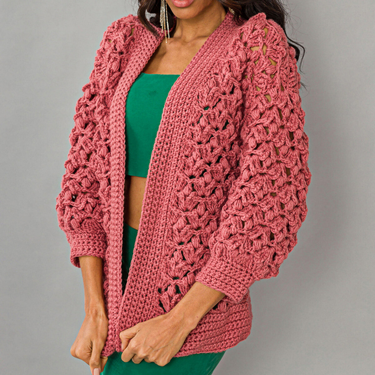 Пастельно-розовый кардиган оверсайз, связанный объёмным и одновременно сетчатым узором. Манжеты, отделка по низу и широкая планка — обычные столбики без накида. Прямой фасон до бедер, широкие рукава на узкой манжете и небольшой V-образный скос горловины.