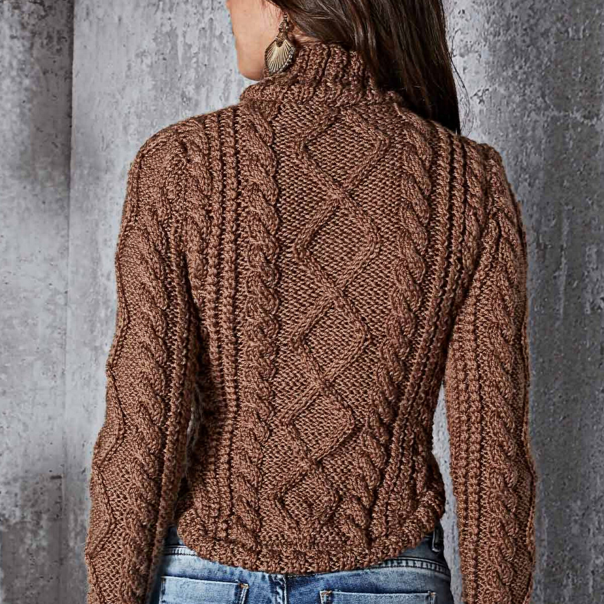 Шоколадный свитер с высоким воротом и необычным закруглённым низом (как связать такой низ, подробно разбирала ЗДЕСЬ). Рельефные ромбы по центру и на рукавах, объёмные и мелкие жгуты по бокам на фоне изнаночной глади. Прямой фасон до пояса, облегающий силуэт, втачной рукав и двойной ворот-стойка.