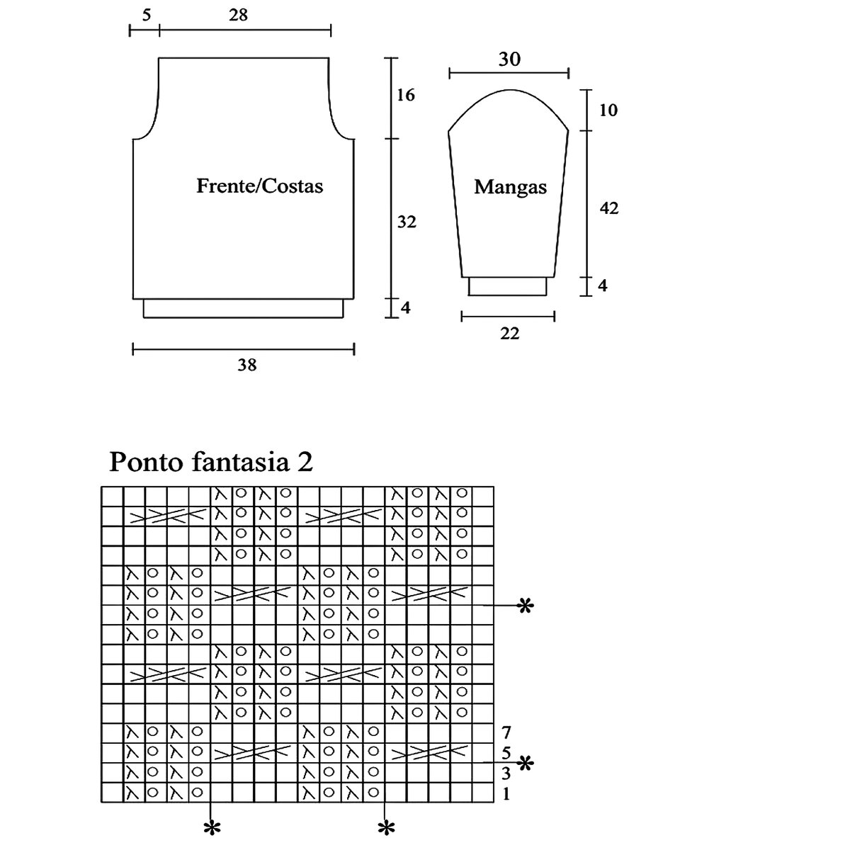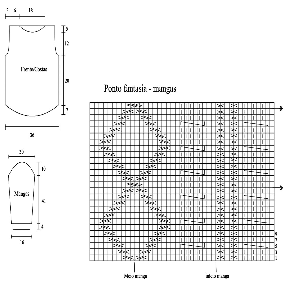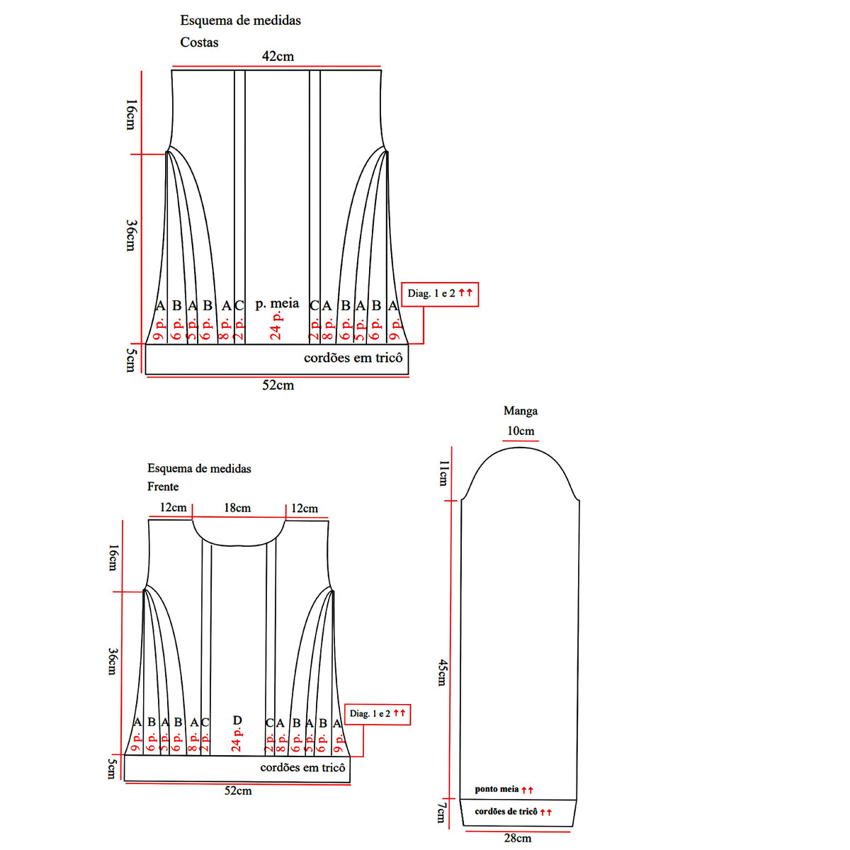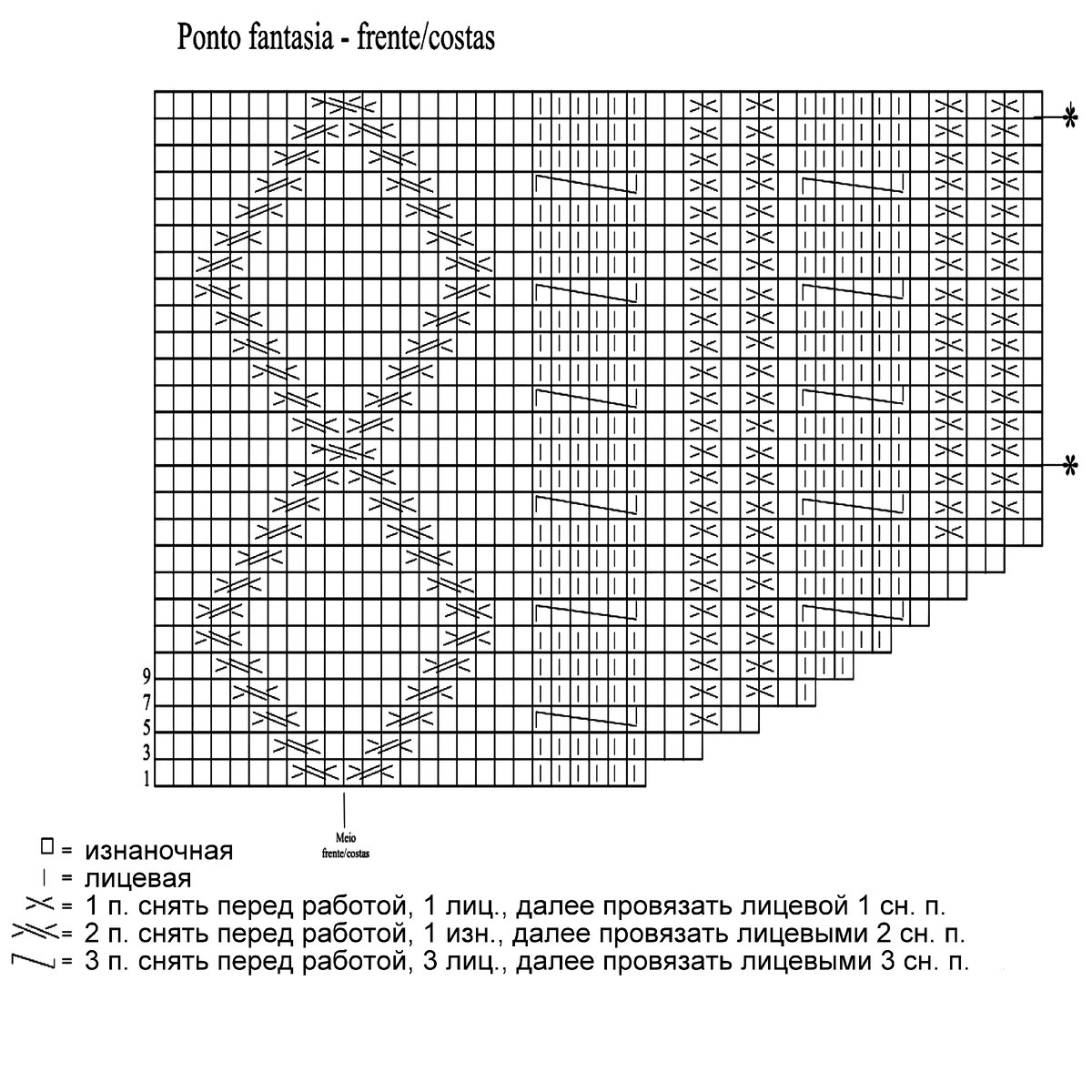 Друзья, будьте внимательны! В оригинальной схеме есть ошибка или, вернее, недочёт — пустой квадрат в условных обозначениях идёт как изнаночная петля, но это обозначение верно не для всей схемы! Если посмотреть внимательно на изделие, то в ажурном узоре с косами пустой квадрат идёт как лицевая петля. Я уточнила этот момент в расшифровке и выделила узор красным (этот же узор идёт на схеме для рукавов и там все пустые квадраты обозначают лицевую петлю).