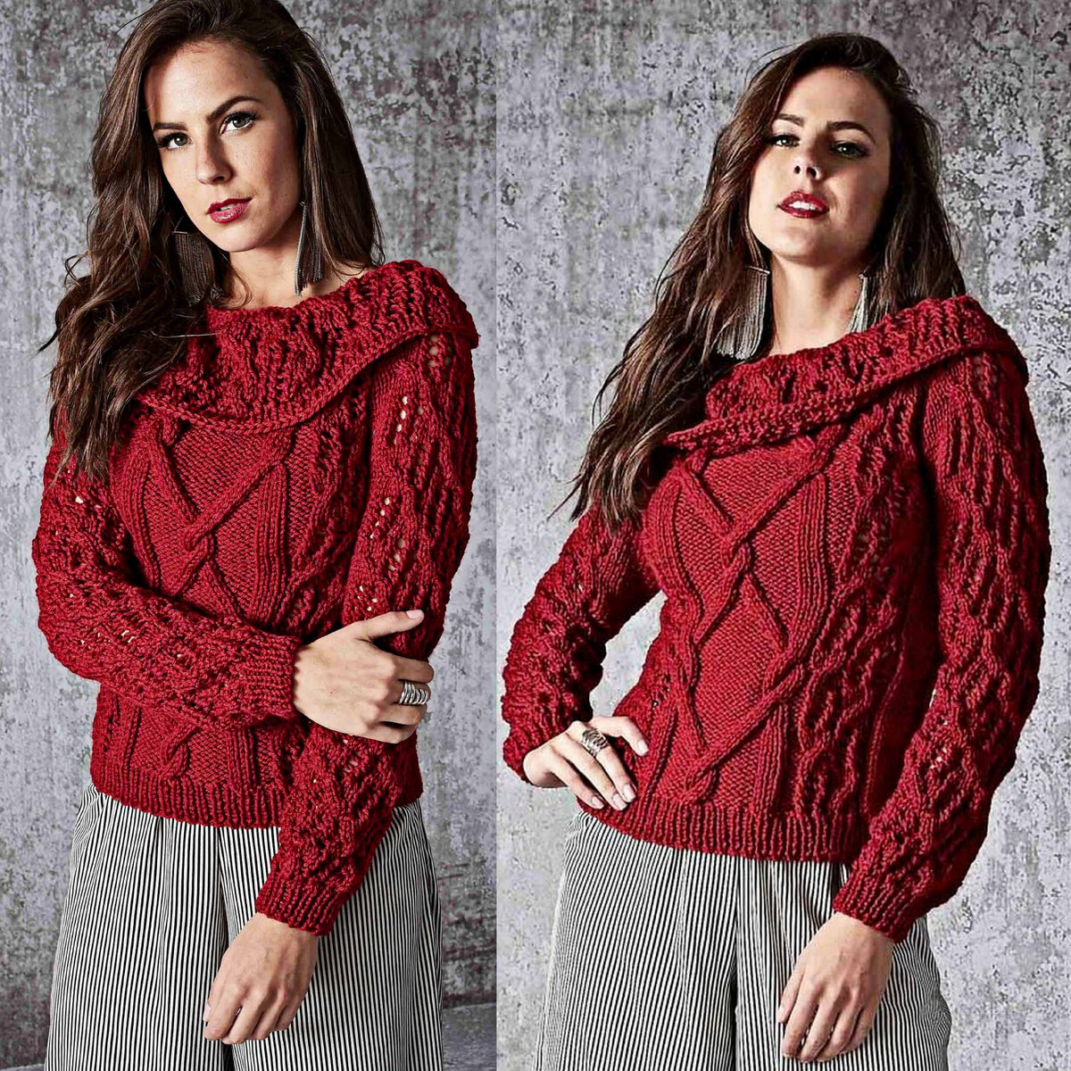 Шикарный вишнёвый свитер с большим отложным воротником. Оригинальная плетёнка по центру и ажур с косами по бокам. Прямой фасон до пояса, втачной рукав, вырез лодочкой и широкий отложной ворот.