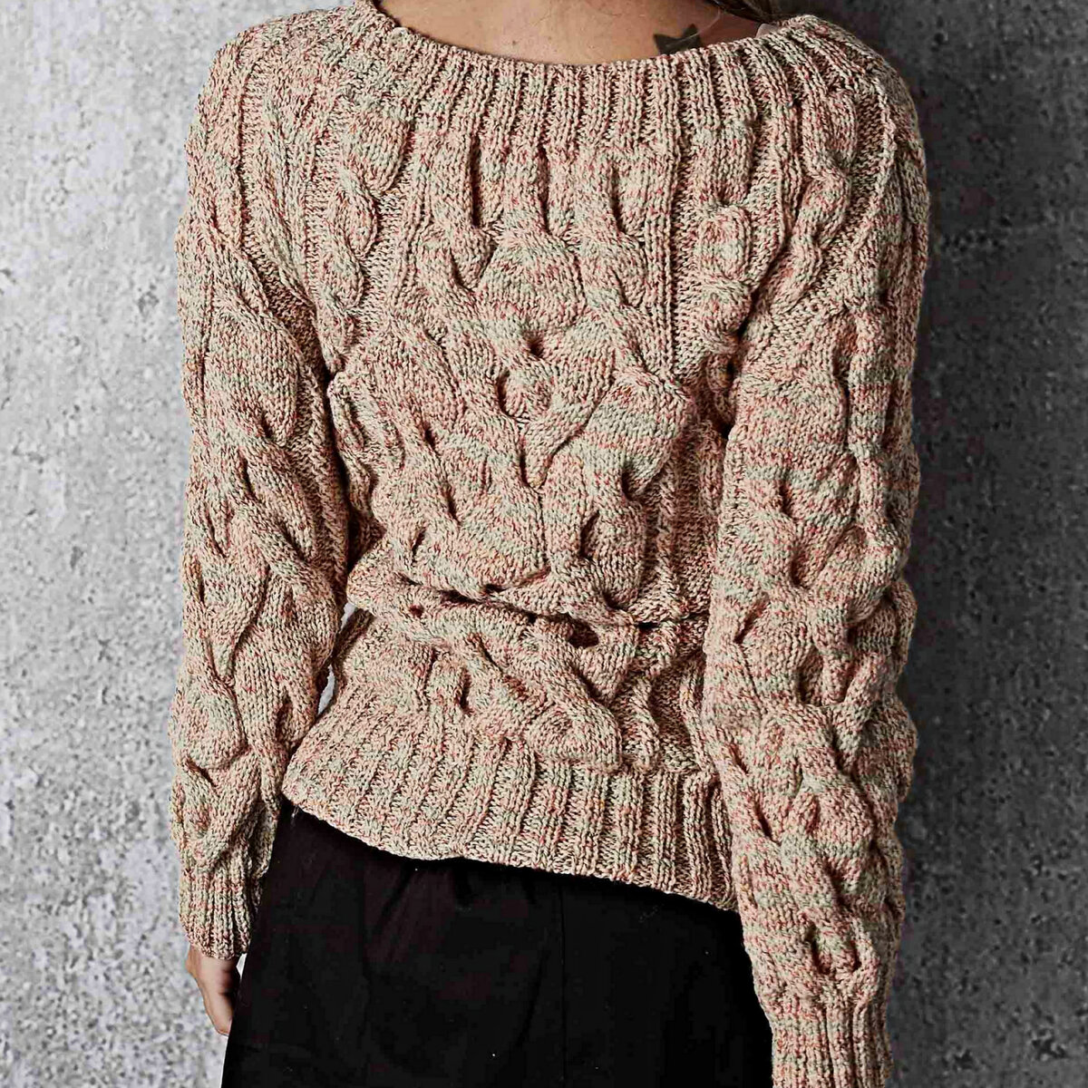 Чудесный меланжевый свитер с объёмными жгутами и косами. Прямой фасон чуть ниже пояса, рукава-реглан и элегантный вырез лодочкой, за счёт которого ворот-резинка красиво ложится по на плечикам.