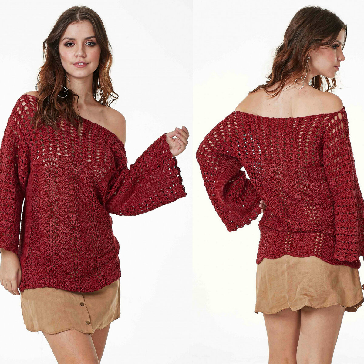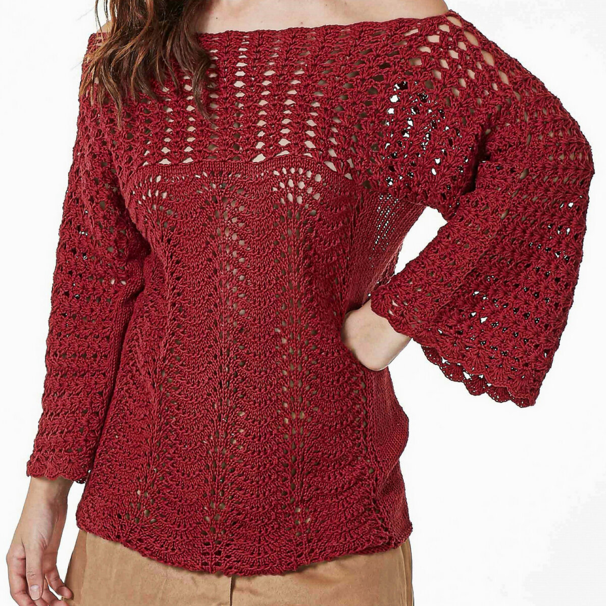 Удлинённый вишнёвый джемпер с роскошными широкими рукавами, создающими имитацию клеш. Верх джемпера (и половина рукавов: в середине рукава идут вставки из лицевой глади спицами) связаны узором «ракушки» крючком, а низ — «павлиний хвост» спицами. Прямой фасон до бедер, рукава-труба и широкий вырез лодочкой, кокетливо обнажающий плечи.