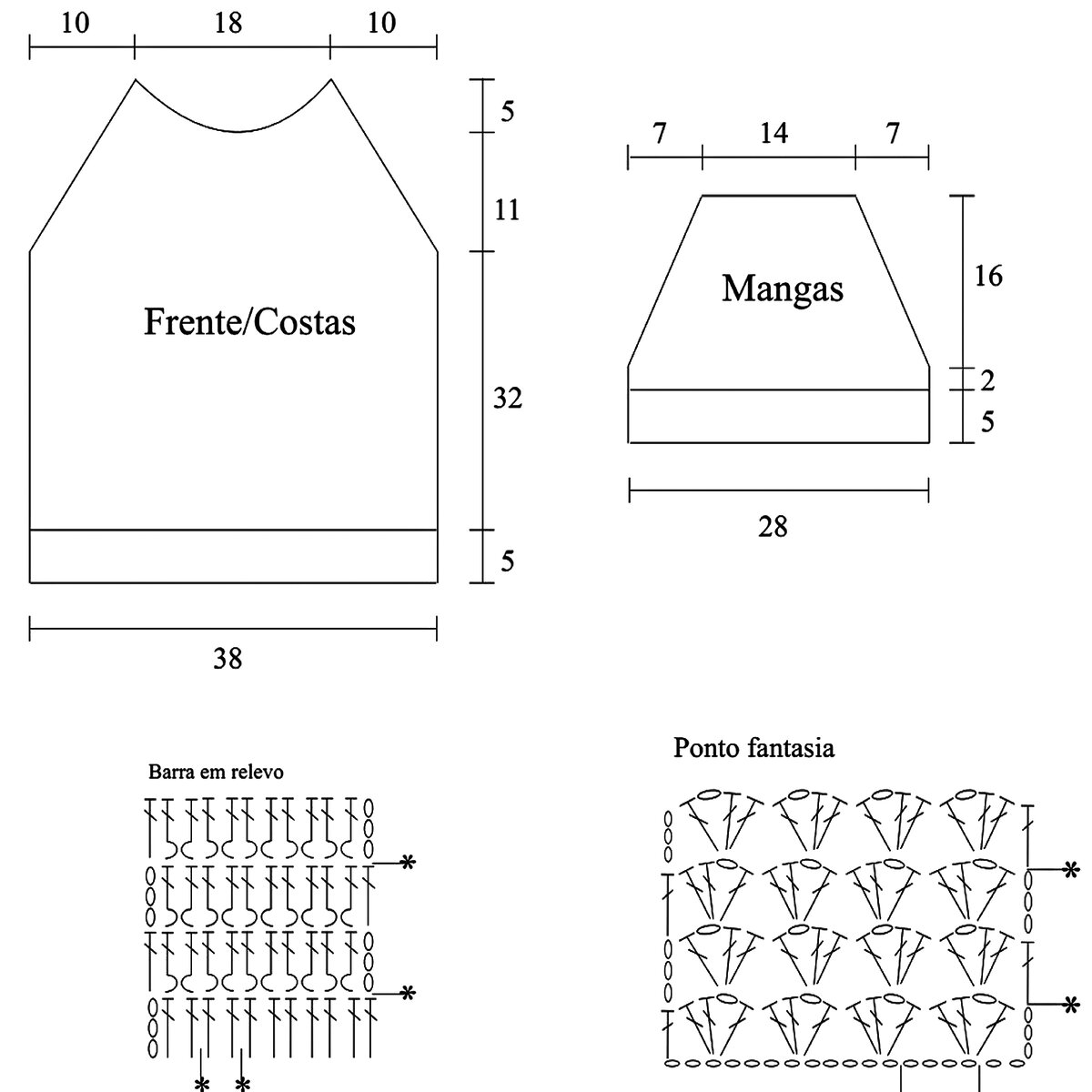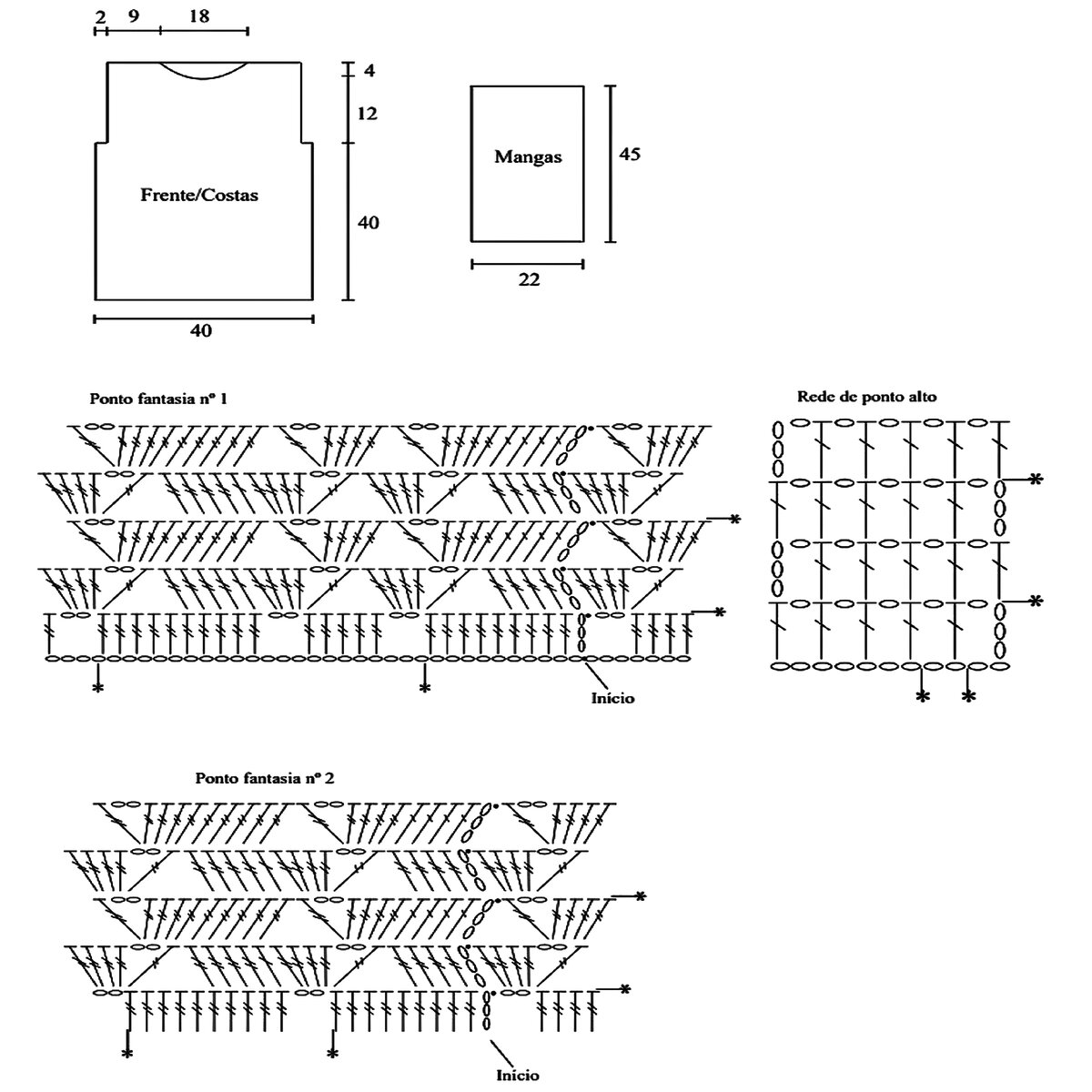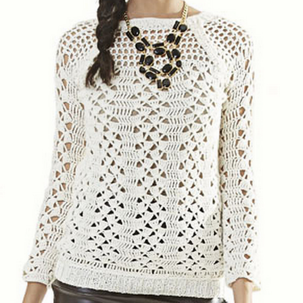 Элегантный джемпер крючком натурально-белого цвета. Крупный сетчатый верх и низ с интересным ажурным узором «веера». Прямой фасон чуть ниже пояса, длинный узкий рукав-реглан и вырез лодочкой.
