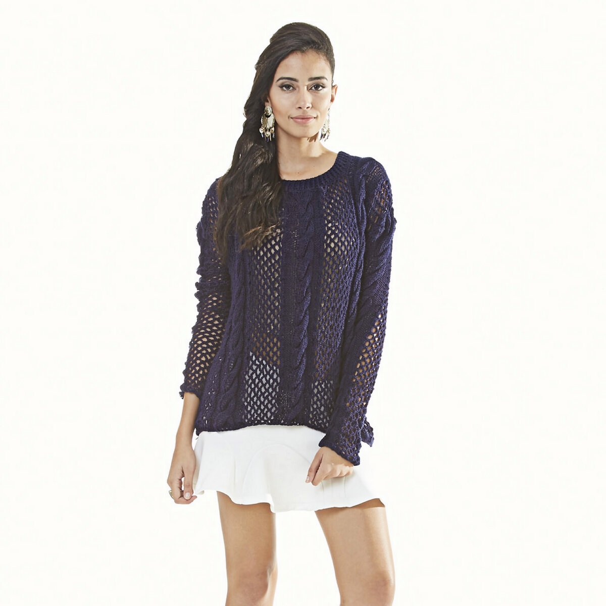 Этот тёмно-синий джемпер — интересная комбинированная модель: полосы с объёмными косами спицами чередуются с крупной сеткой крючком. Обратите внимание, что полосы с косами вяжутся вертикально, а сетка крючком надвязывается уже после по готовым полосам поперёк, одновременно соединяя их в единое полотно. Прямой фасон до бедер, длинный рукав-труба и круглый вырез горловины.