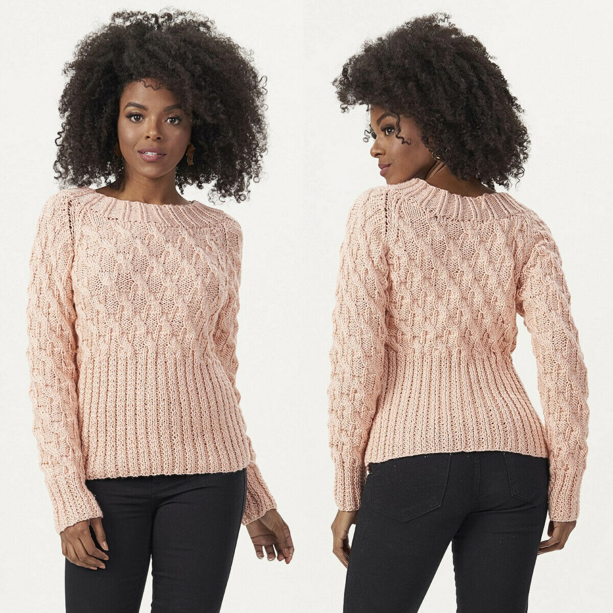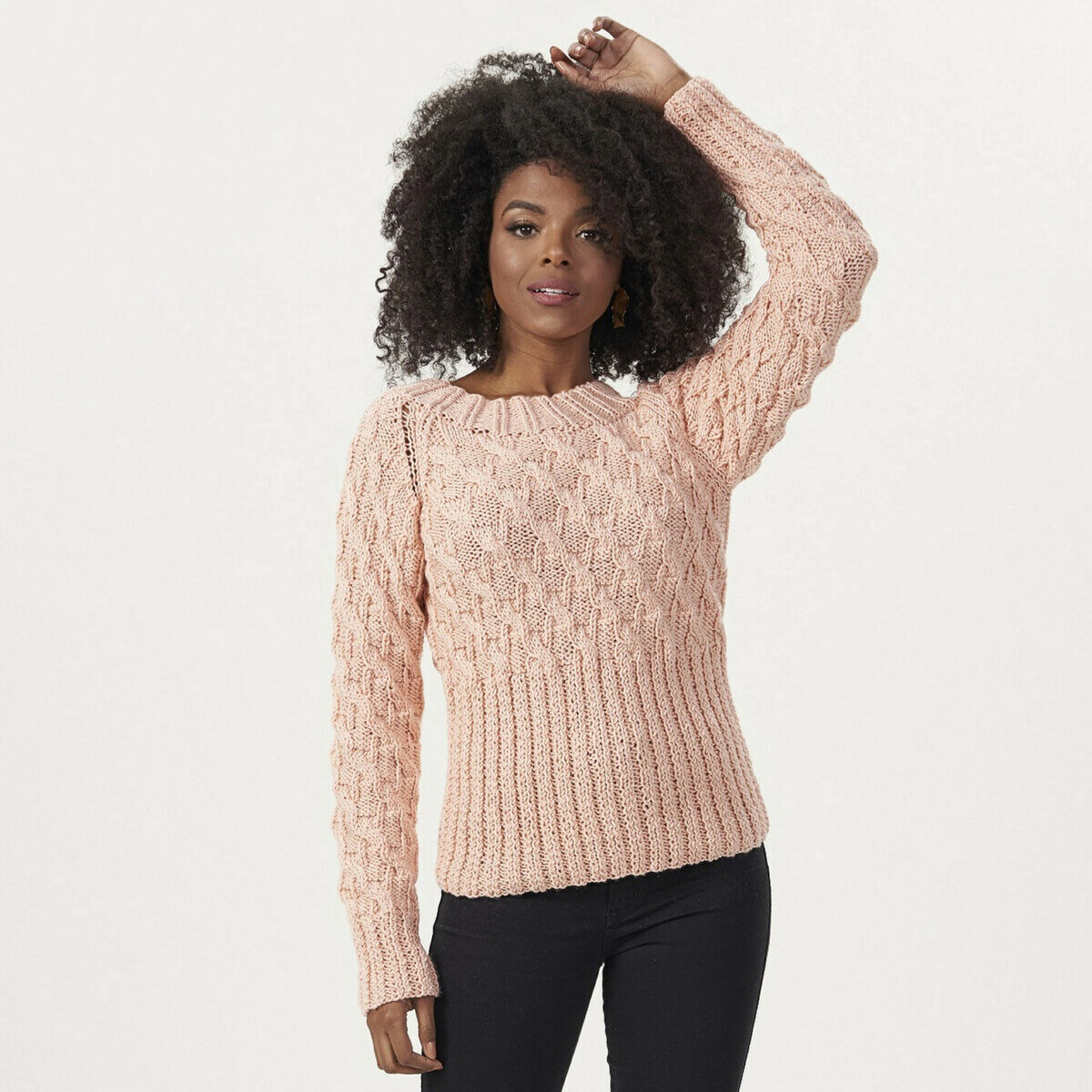 Нежный персиковый свитер с простым рельефным узором из жгутов. Широкая резиночка внизу, переходящая в основной узор, подчёркивает талию, делая фигуру особенно изящной и привлекательной.