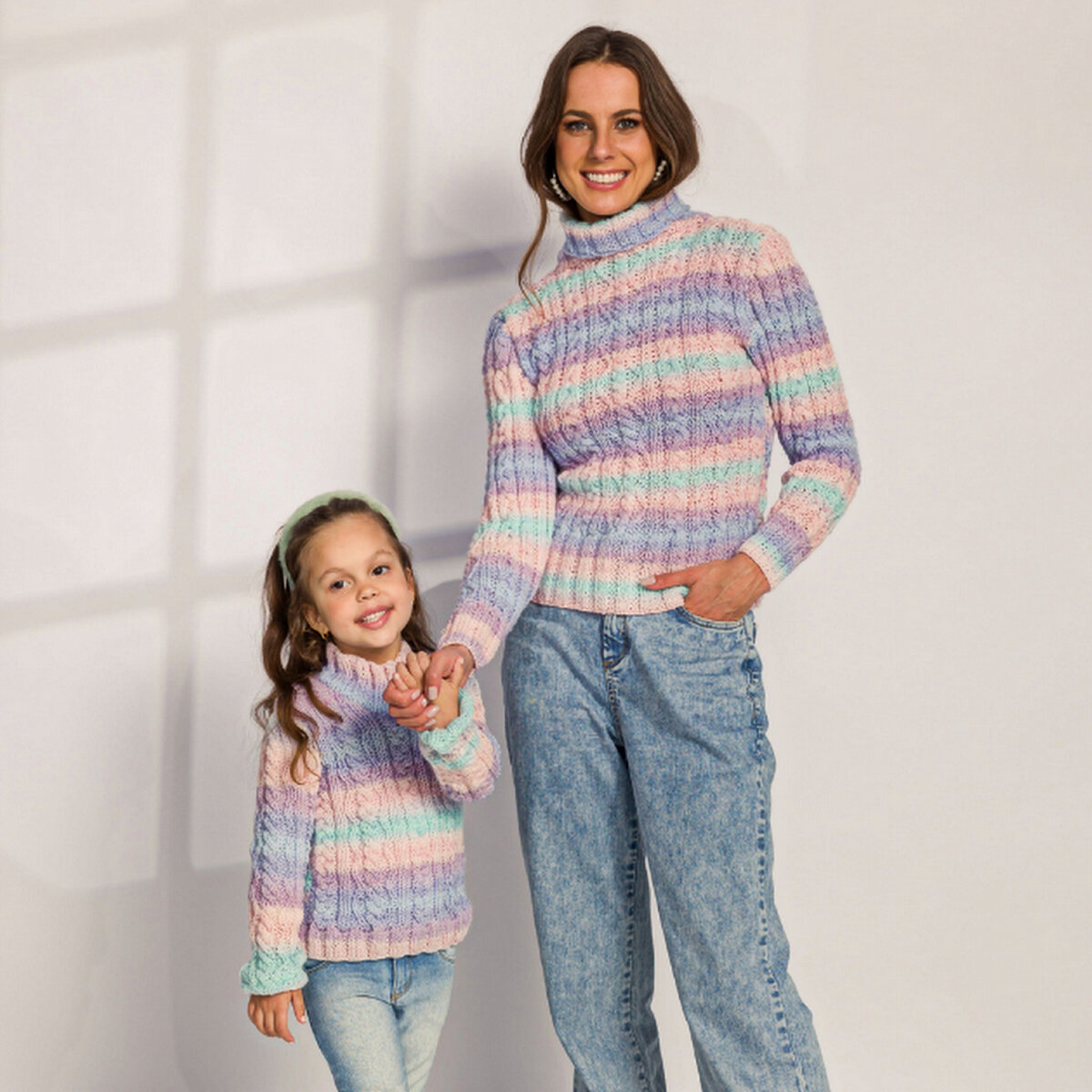 Уютный свитер из секционной пряжи с мягкими цветовыми переходами — отличная идея для family look (пару лет назад это был очень популярный тренд, сейчас встречаю нечасто)! Прямой, слегка укороченный фасон до талии, втачной рукав и высокий ворот. Классические косы и жгуты.