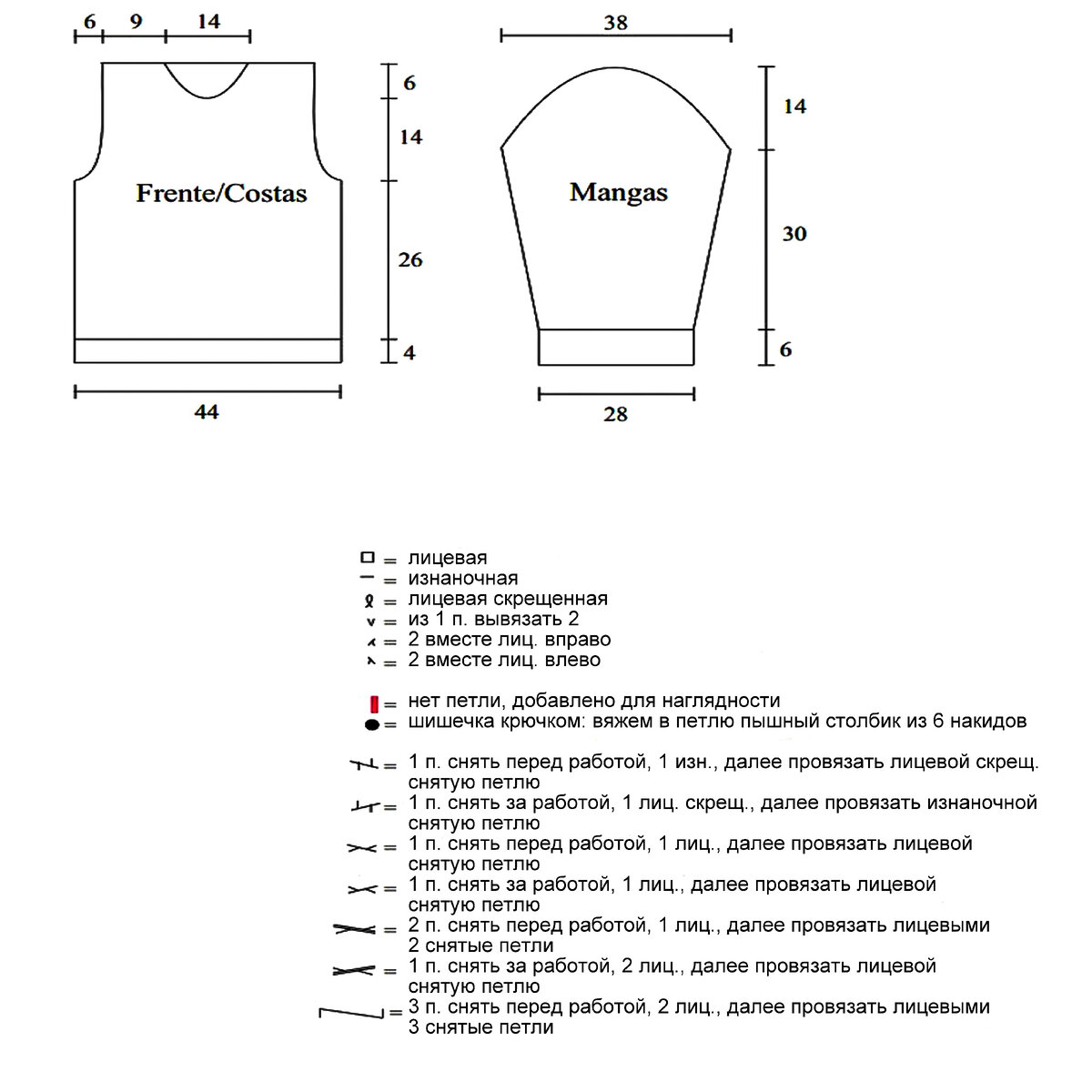 - Спинка, рукава и боковые вставки впереди вяжутся рельефной резинкой: