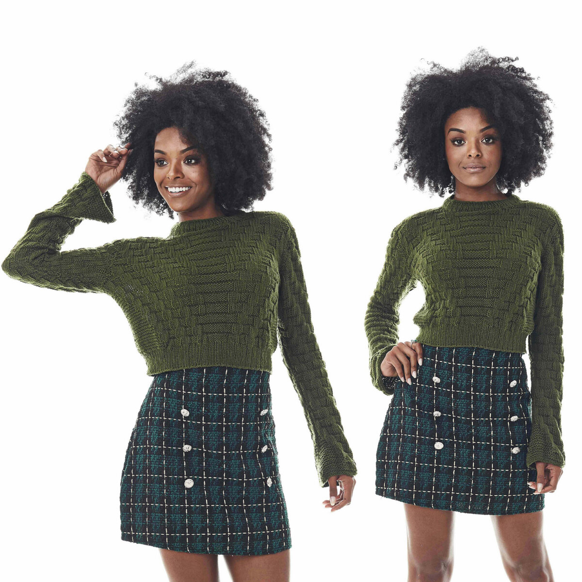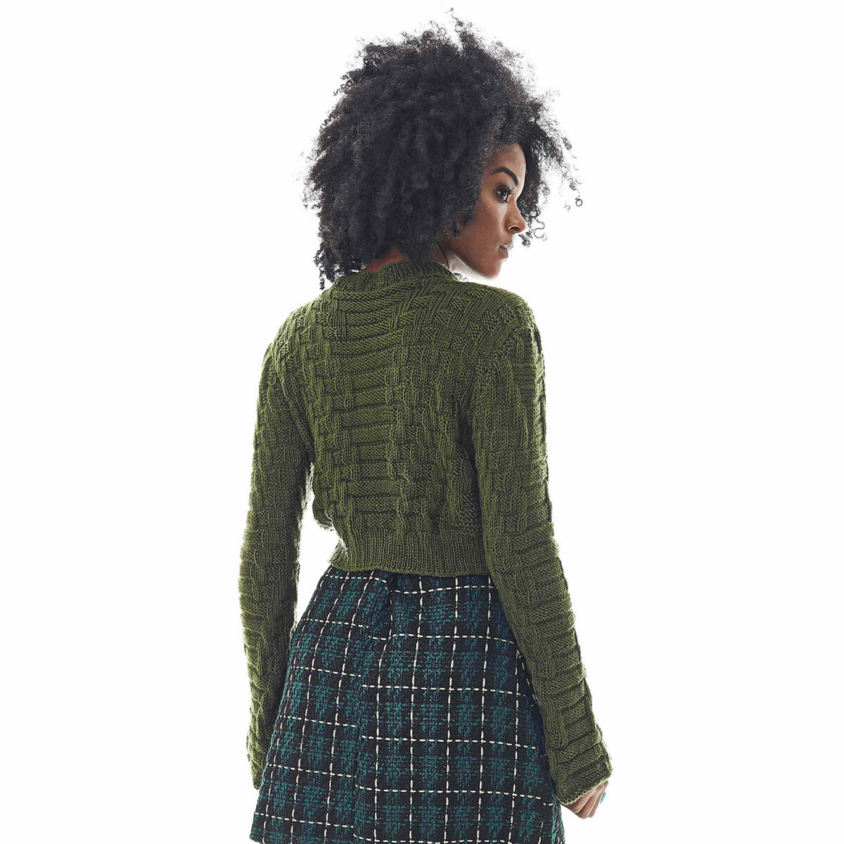 Укороченный свитер цвета хаки с рельефным теневым узором, имитирующим косы. Отличный вариант для тех, кто не хочет добавлять лишнего объёма изделию и немного сэкономить пряжи. Прямой фасон чуть выше талии, втачной рукав с расклешенными манжетами и небольшой круглый вырез горловины.